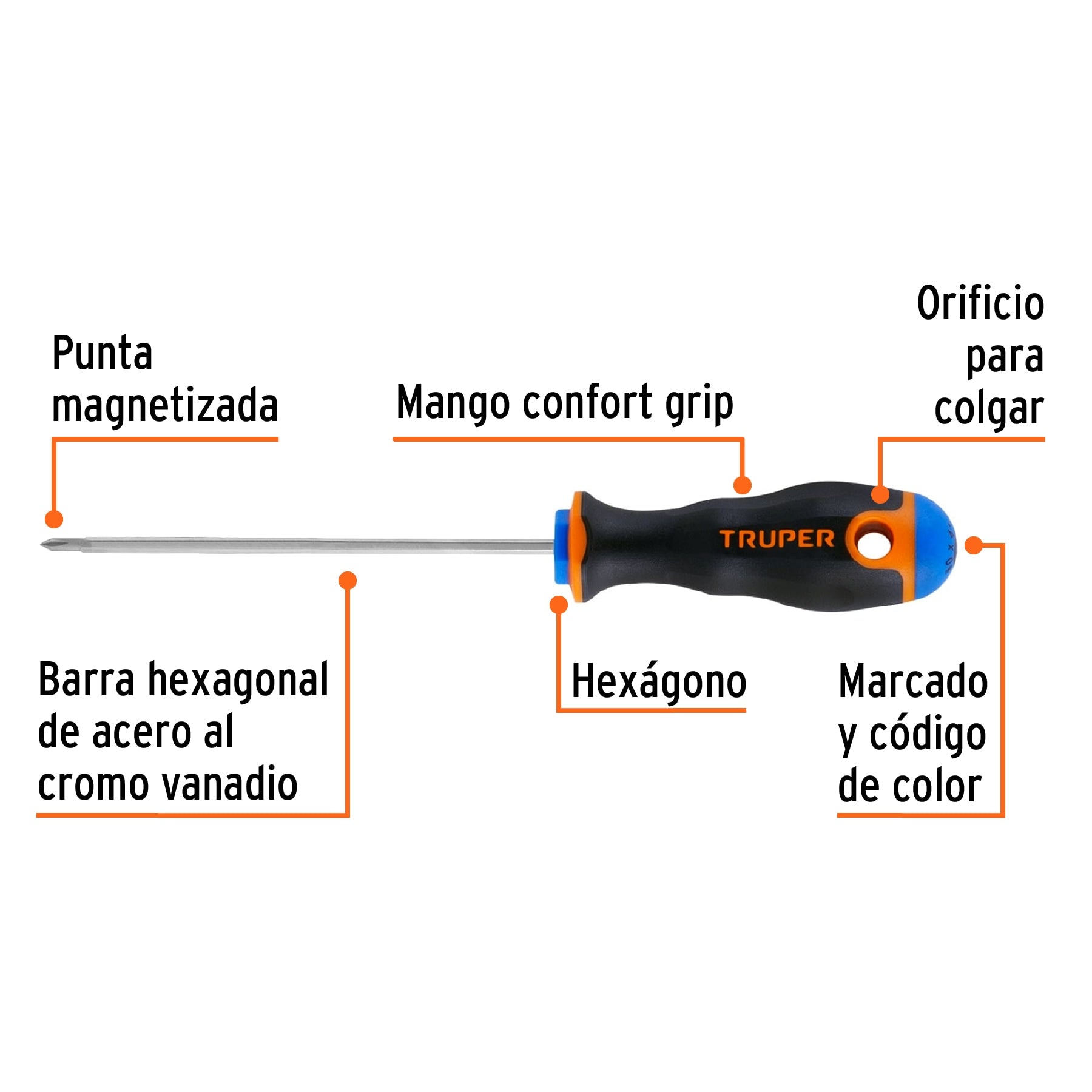 Desarmador de cruz diseñado para trabajos de ajuste y mantenimiento de precisión. Incorpora barra hexagonal de acero al cromo vanadio para mayor resistencia al desgaste y punta magnetizada que facilita el manejo del tornillo. Su mango Comfort Grip con orificio para colgar ofrece un agarre cómodo y seguro durante el uso.