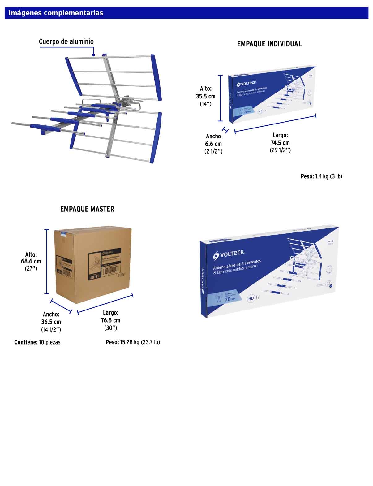 Esta antena aérea está diseñada para la recepción de señal HD de televisión abierta en bandas UHF. Cuenta con un cuerpo de aluminio ligero y resistente a la intemperie, lo que la hace adecuada para instalaciones exteriores con buen desempeño y durabilidad.