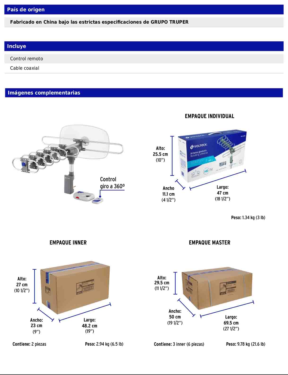 Cuenta con rotación de 360° mediante control remoto, lo que facilita orientar la antena sin necesidad de ajustes manuales. Es compatible con señales VHF, UHF y radio digital, y puede conectarse a más de un televisor, siendo una solución práctica para instalaciones residenciales.