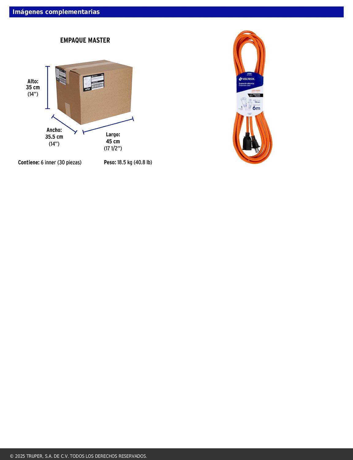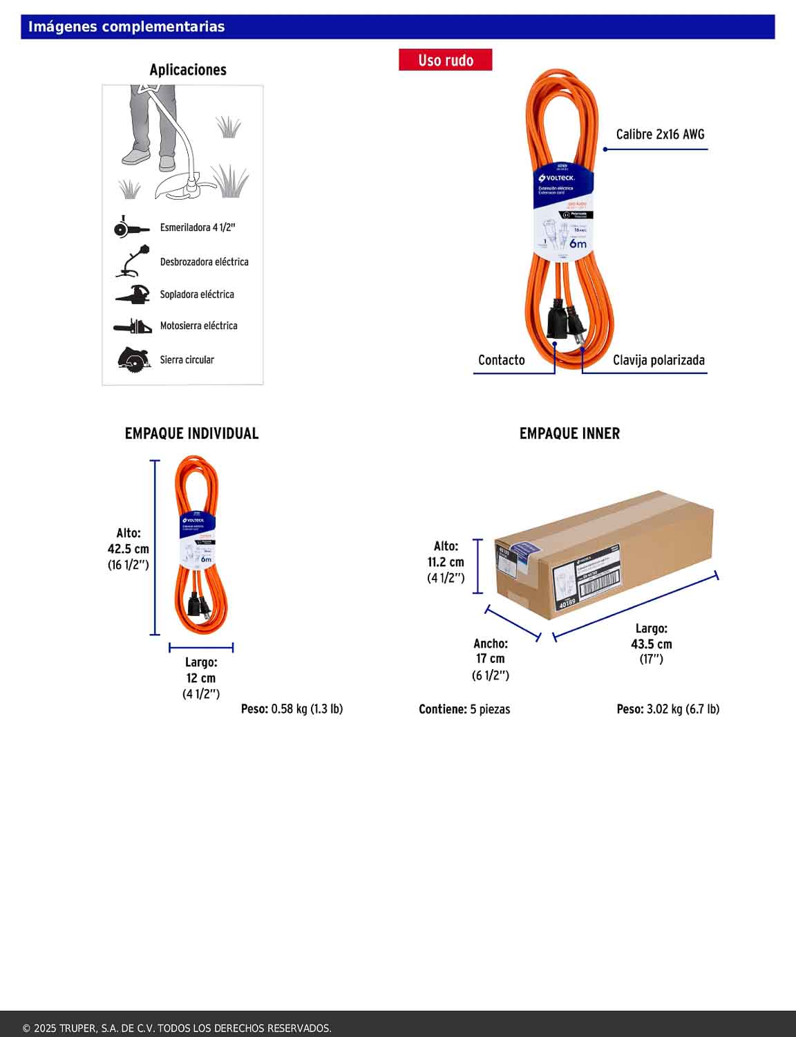 Extensión eléctrica de uso rudo diseñada especialmente con un solo contacto polarizado para conectar equipos como desbrozadoras, motosierras y sopladoras. Fabricada con cubierta de PVC resistente a la propagación de la flama y apta para uso en interiores. Cumple con la norma NOM-003-SCFI.