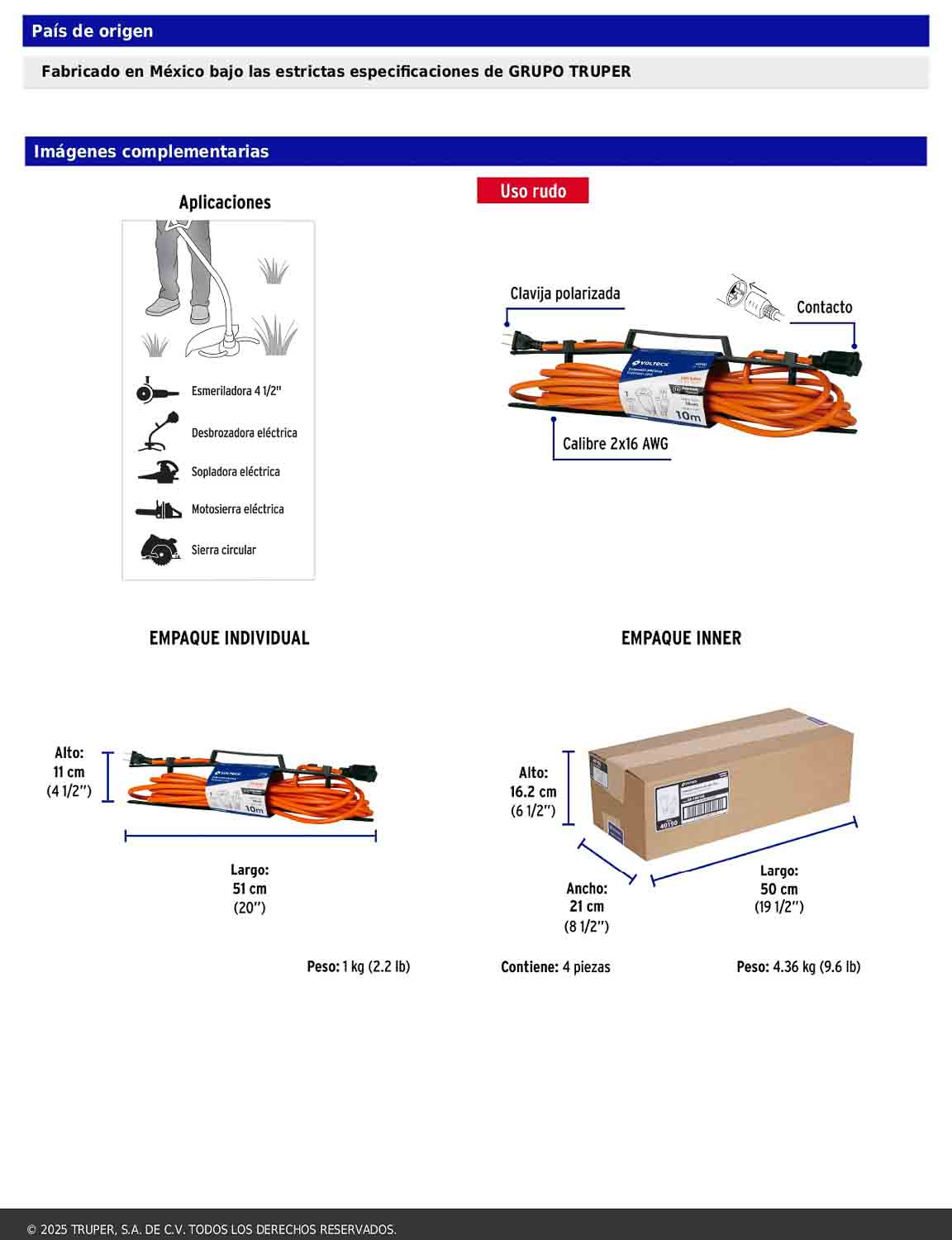 Extensión eléctrica de uso rudo diseñada especialmente con un solo contacto polarizado para conectar máquinas como desbrozadoras, motosierras y sopladoras. Fabricada con cubierta de PVC resistente a la propagación de la flama y apta para uso en interiores. Cumple con la norma NOM-003-SCFI.
