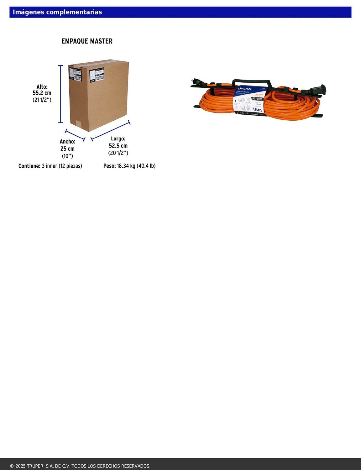 Extensión de uso rudo diseñada especialmente con un solo contacto para conectar máquinas como desbrozadoras, motosierras y sopladoras. Fabricada con cubierta de PVC resistente a la propagación de la flama y adecuada para aplicaciones en interiores. Cumple con la norma NOM-003-SCFI.