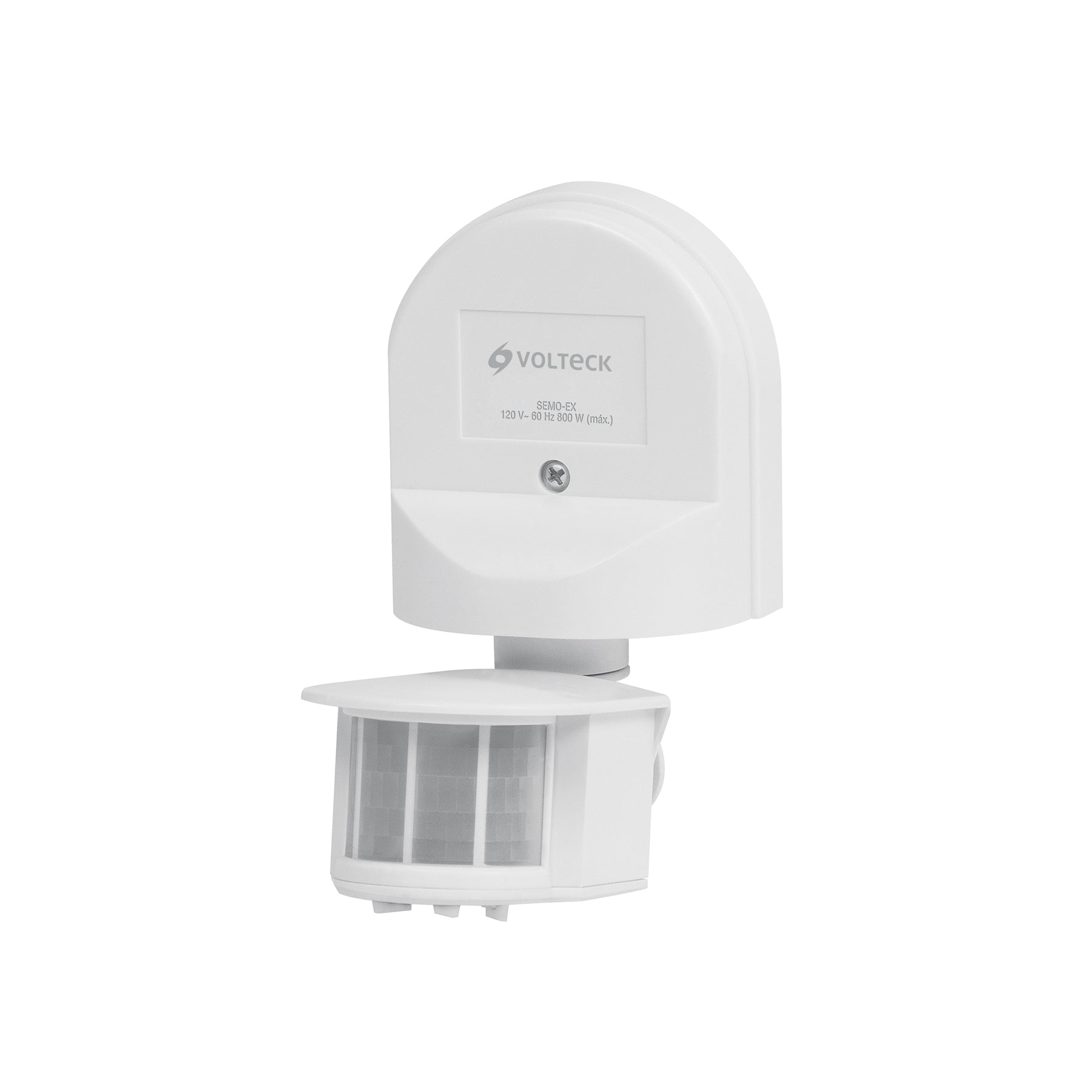 Sensor de movimiento para uso exterior, fabricado en policarbonato e ideal para instalación en pared. Compatible con lámparas LED, ahorradoras, halógenas e incandescentes, y cumple con la norma NOM-003-SCFI.