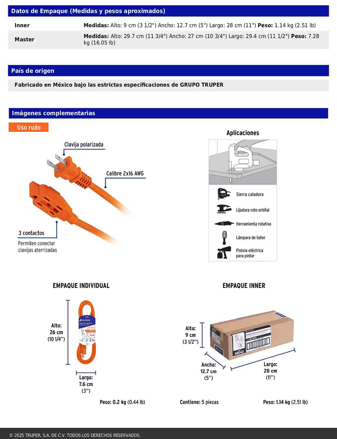 Extensión eléctrica diseñada para uso rudo en interiores, fabricada con cubierta de PVC resistente a la propagación de la flama. Cuenta con tres contactos polarizados y un diseño que permite conectar clavijas aterrizadas. Cumple con la norma NOM-003-SCFI.