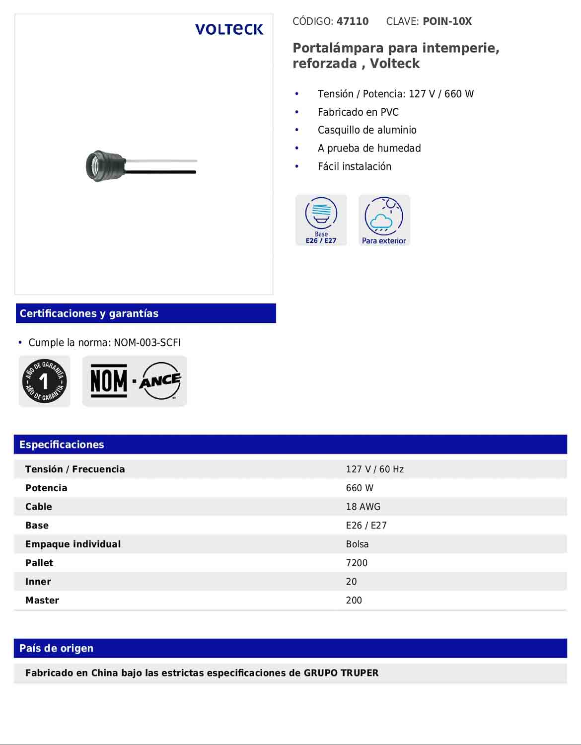 Portalámpara reforzada ideal para exteriores, fabricada en PVC con casquillo de aluminio. Es a prueba de humedad, de fácil instalación y cumple con la norma NOM-003-SCFI.
