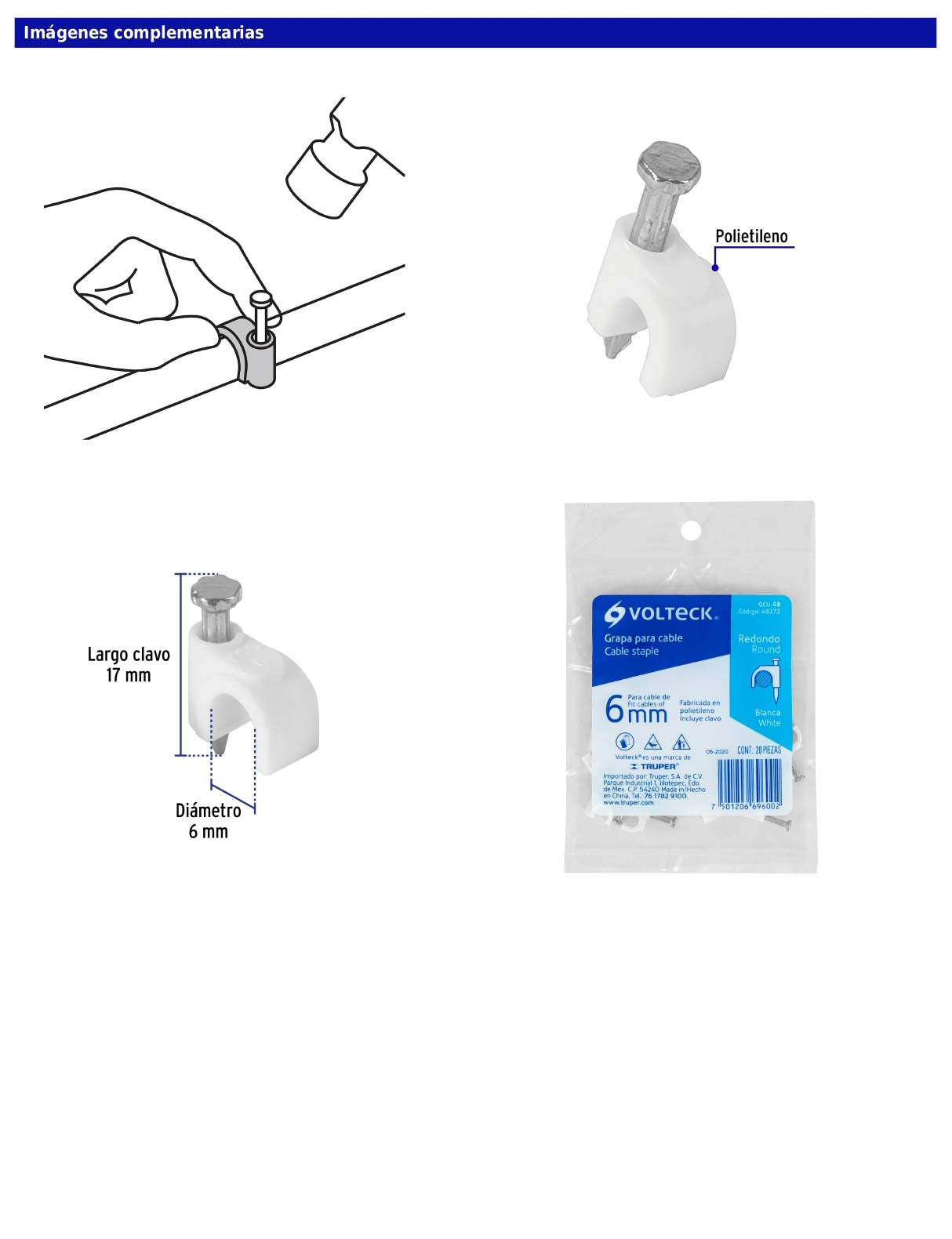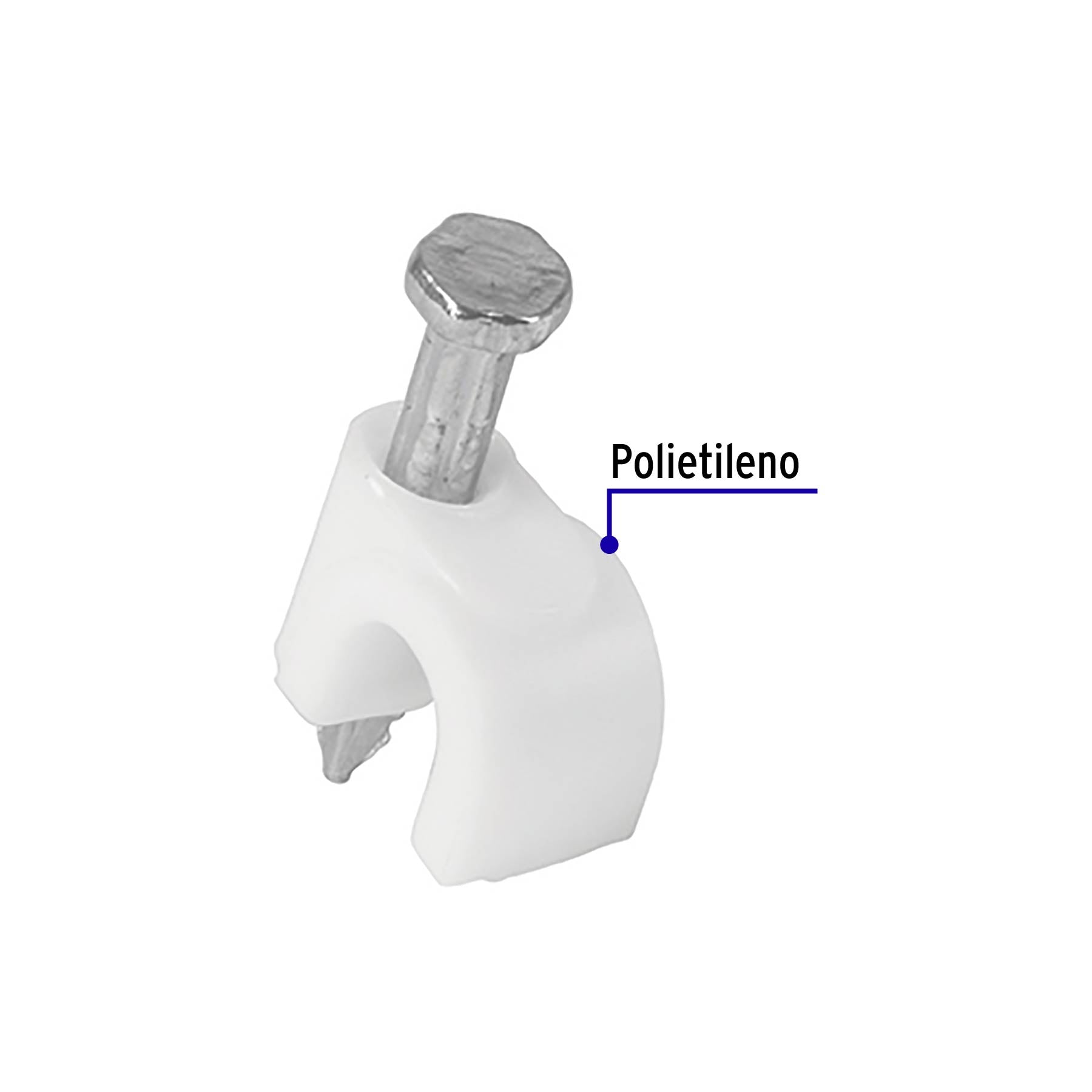 Estas grapas están diseñadas para la sujeción segura de cables redondos, como cables coaxiales, ayudando a mantener instalaciones ordenadas y bien fijadas. Están fabricadas en polietileno e incluyen clavo metálico integrado, lo que permite una instalación práctica y confiable en superficies sólidas.