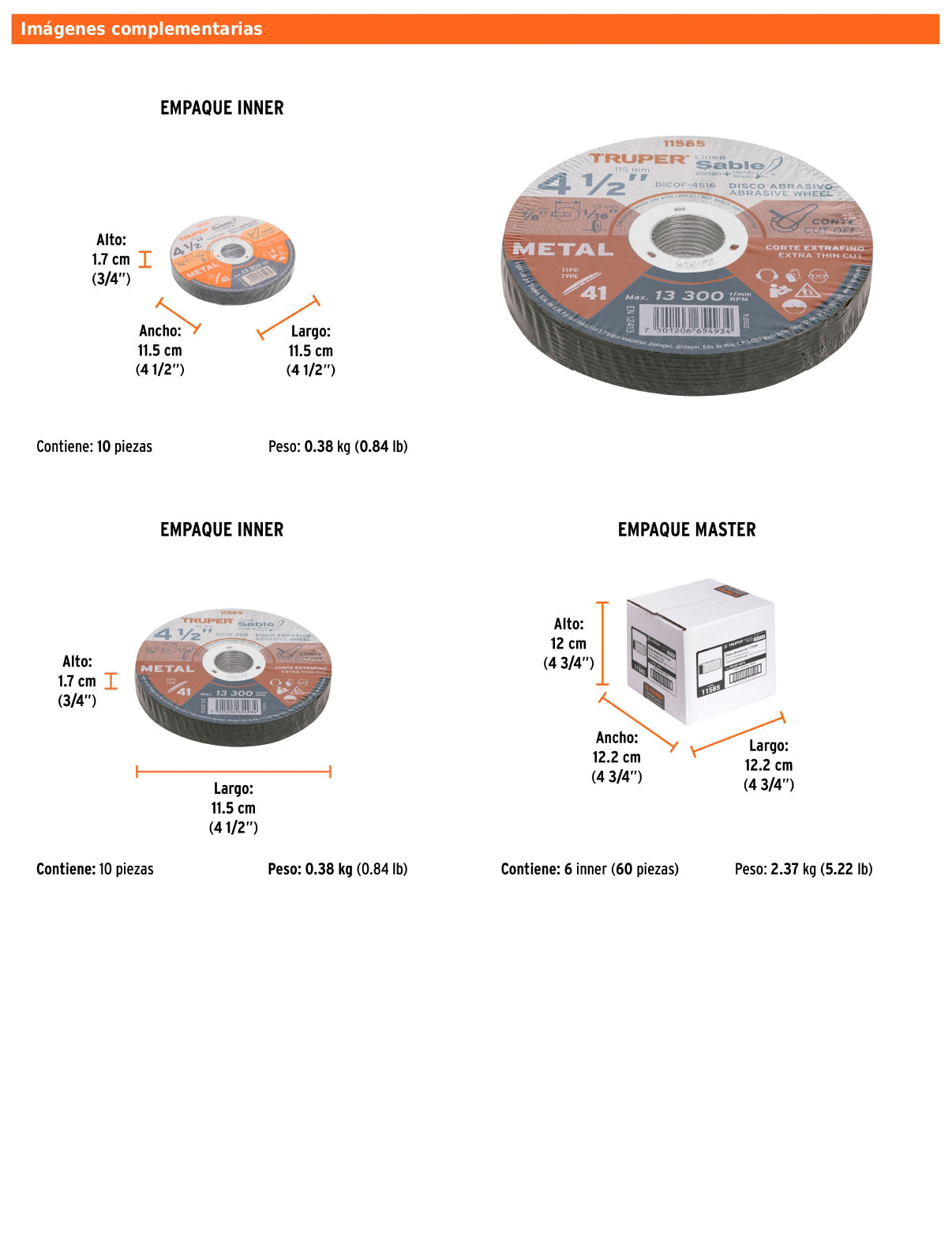 - Diámetro exterior: 4 1/2 in (115 mm).