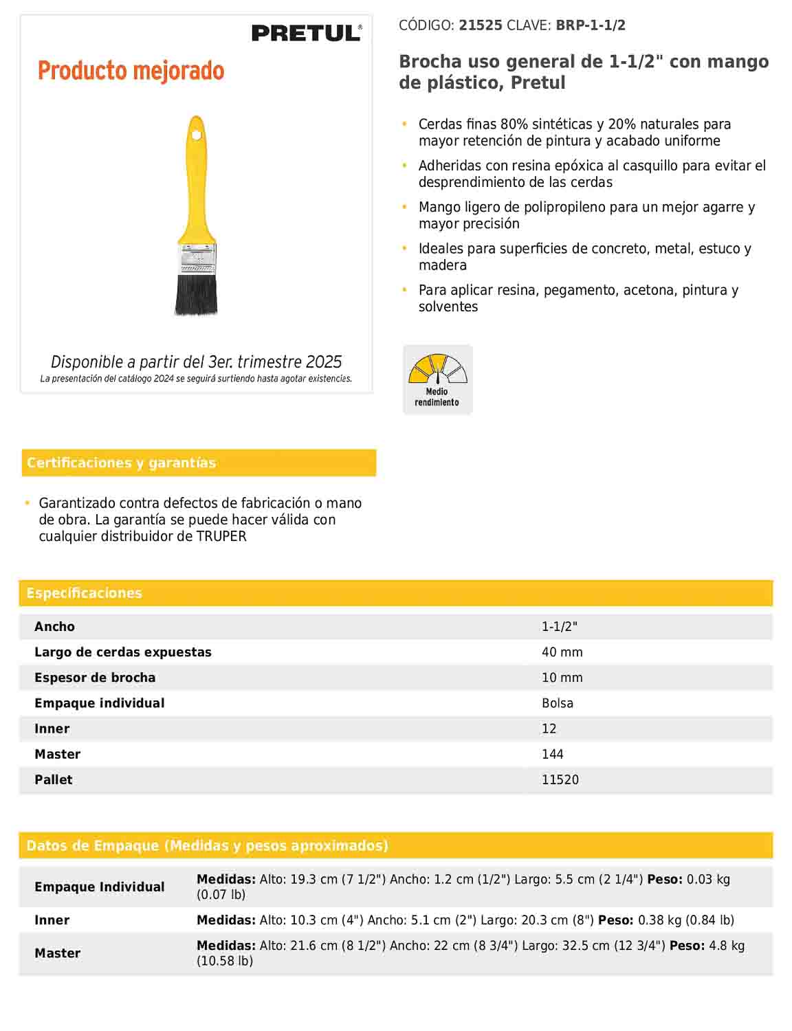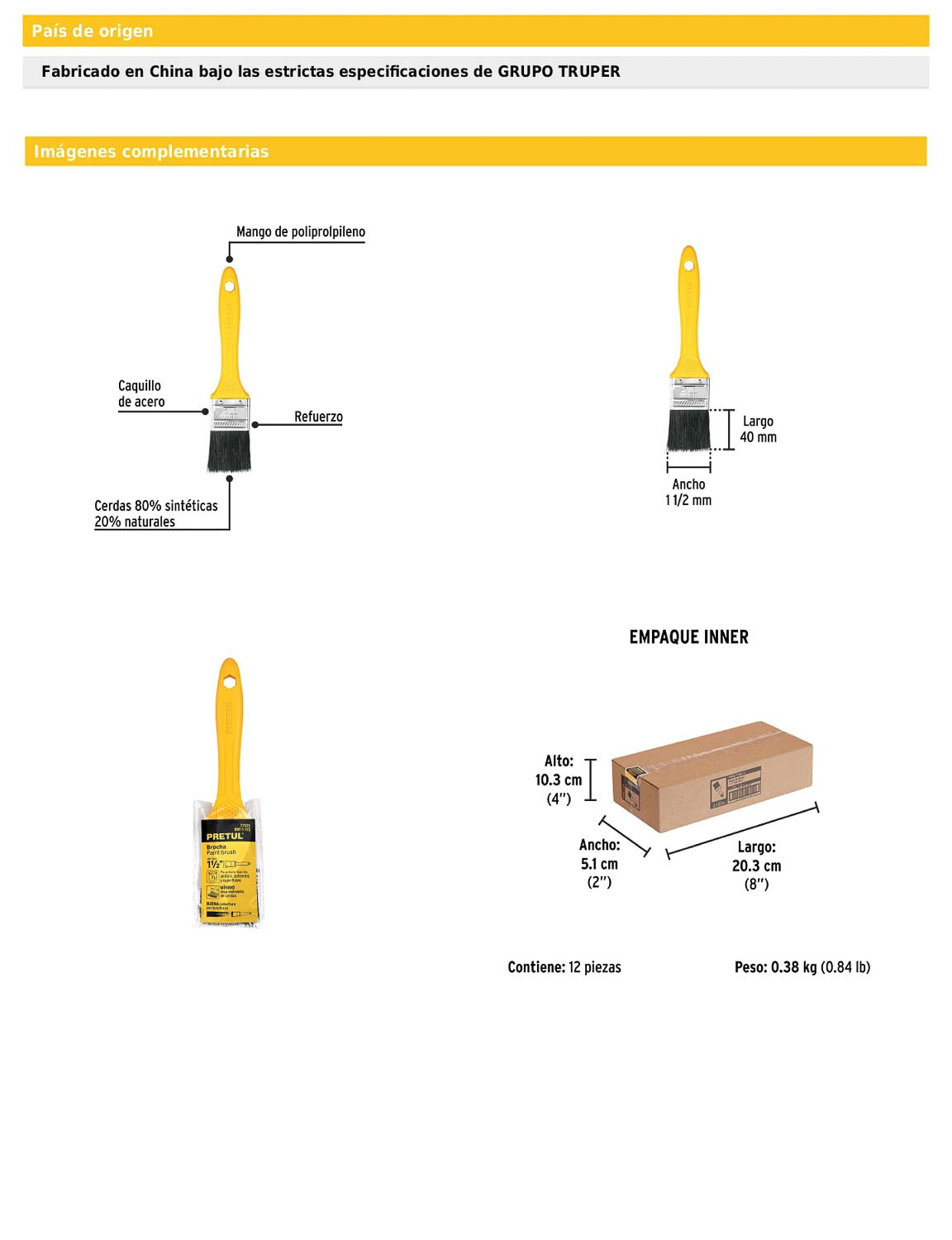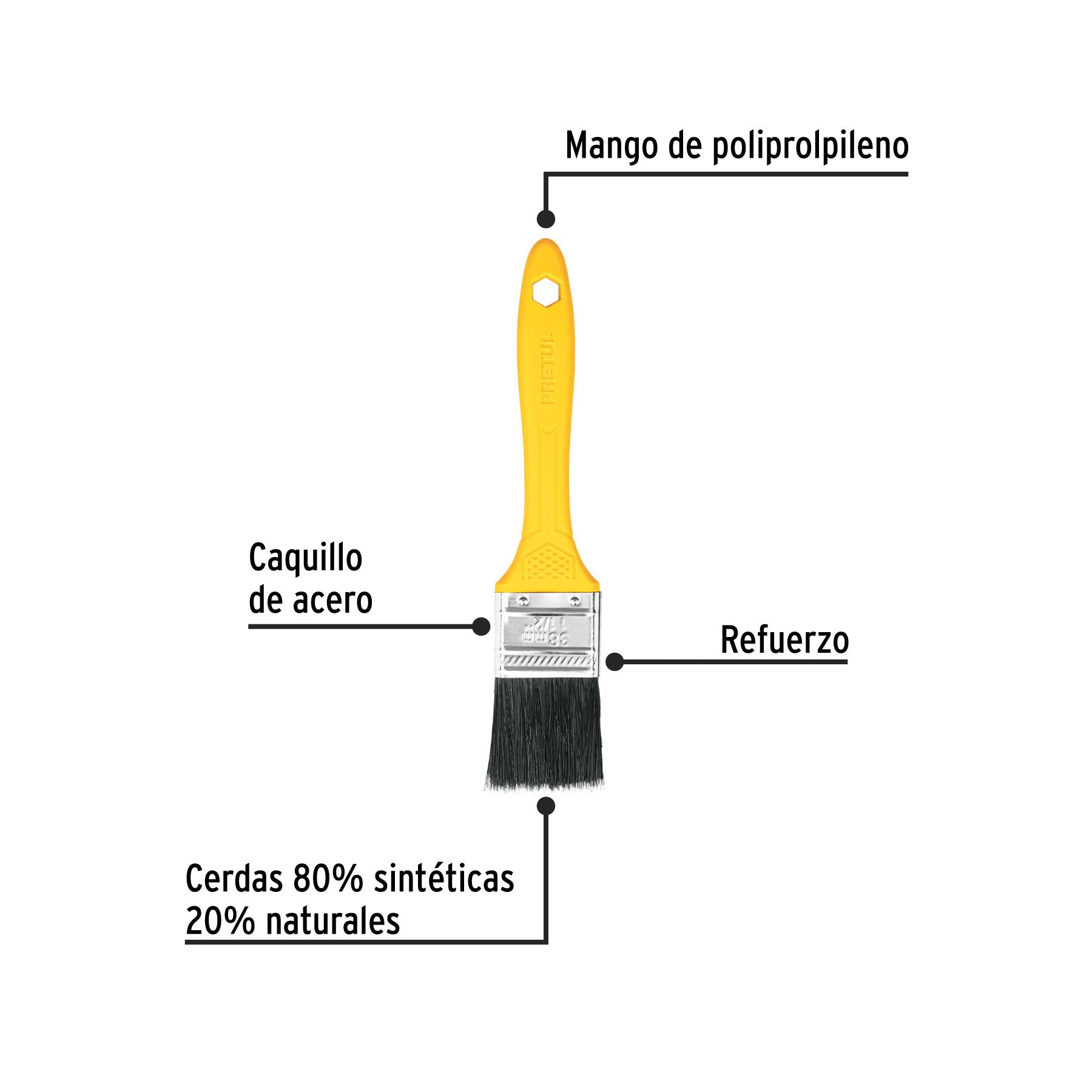 Brocha de uso general con cerdas finas 80% sintéticas y 20% naturales que ofrecen excelente retención de pintura y un acabado uniforme. Las cerdas están adheridas con resina epóxica al casquillo para evitar desprendimientos y garantizar durabilidad. Su mango de polipropileno es ligero, cómodo y facilita un mejor agarre y precisión. Ideal para aplicar pintura, resina, pegamento, acetona o solventes en superficies de concreto, metal, estuco y madera.