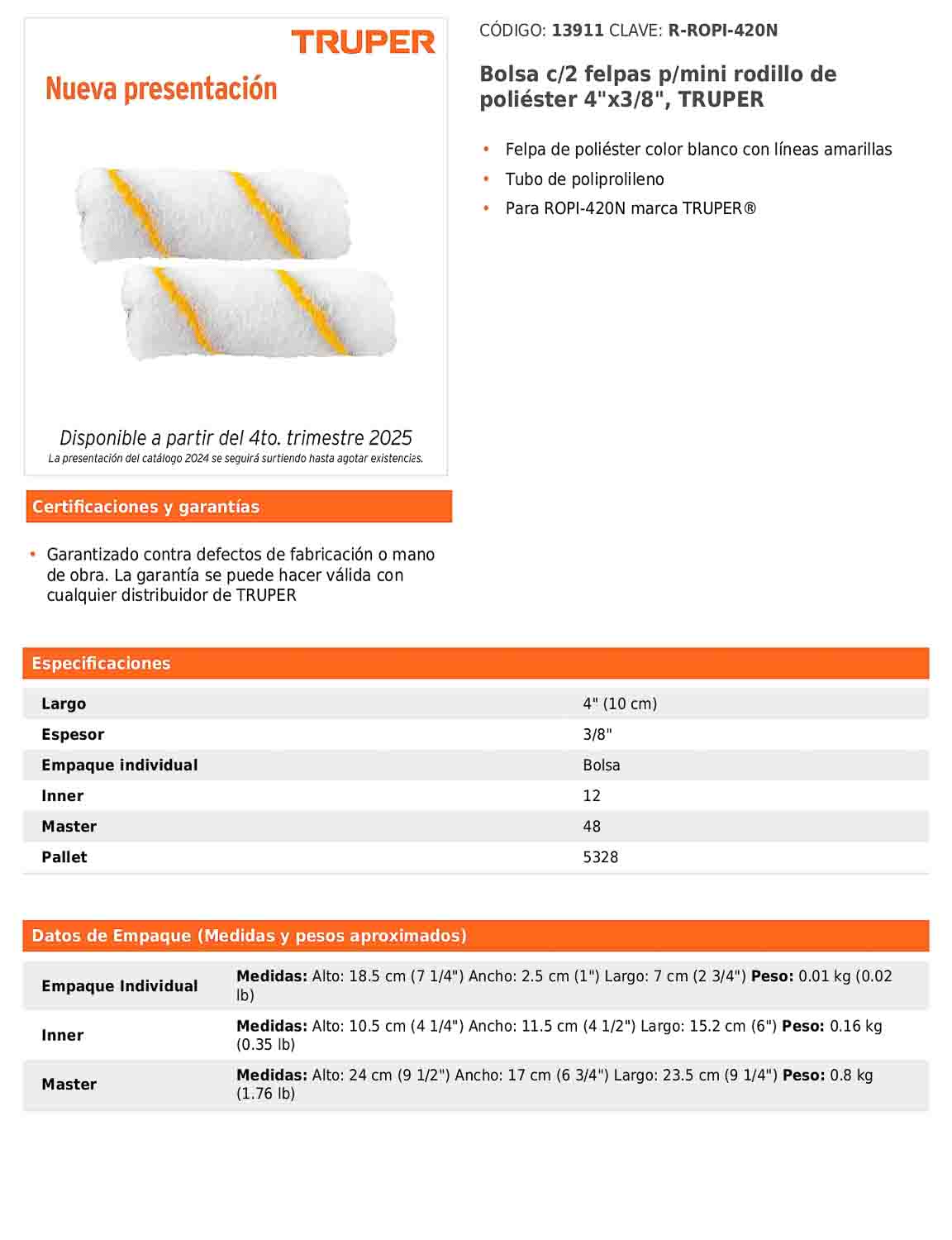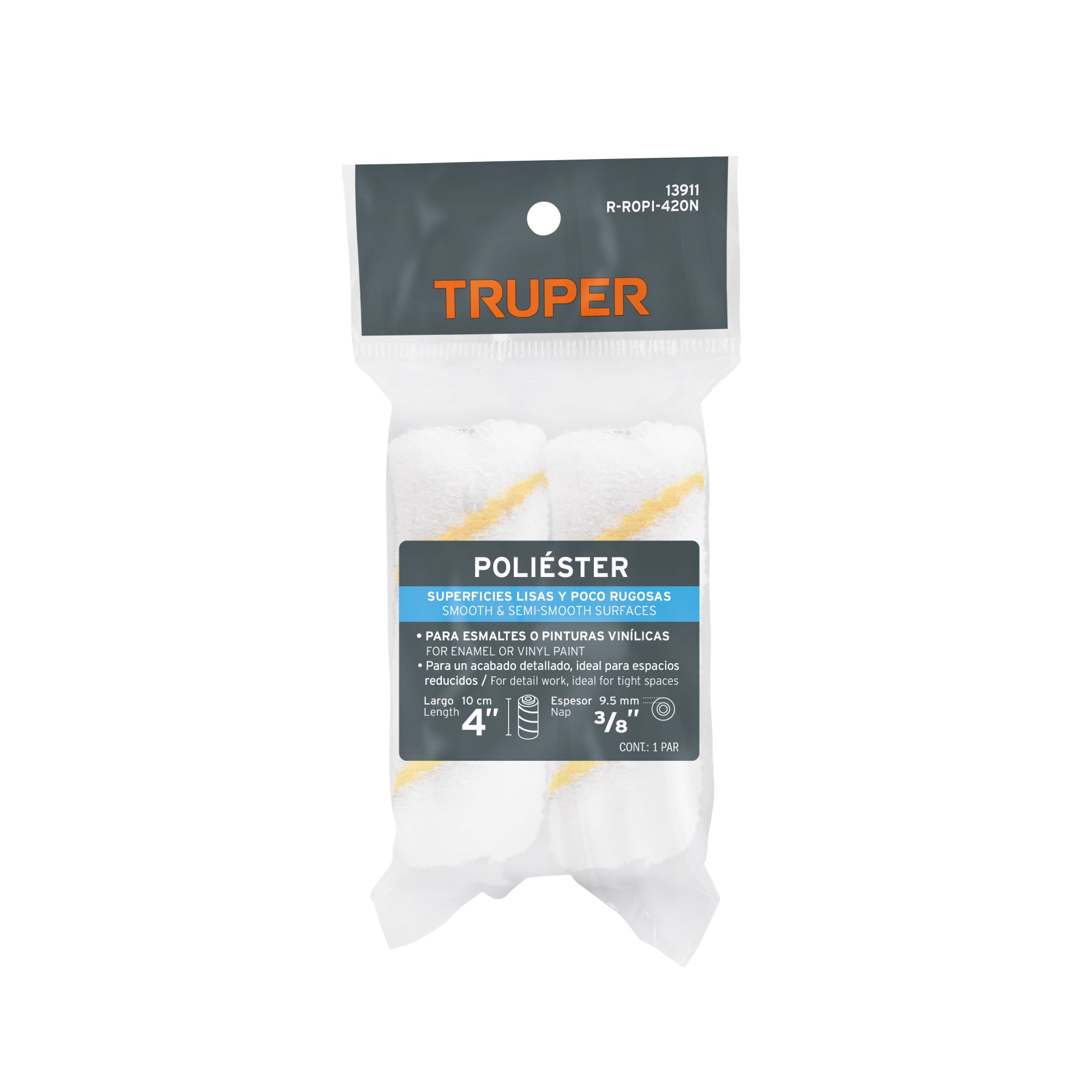 Juego de dos felpas de poliéster color blanco con líneas amarillas, diseñadas para lograr una aplicación uniforme y eficiente de pintura. Incorporan tubo interno de polipropileno que brinda durabilidad y resistencia. Compatibles con el modelo ROPI-420N, ideales para trabajos de retoque o aplicación de pintura en superficies pequeñas y detalladas.