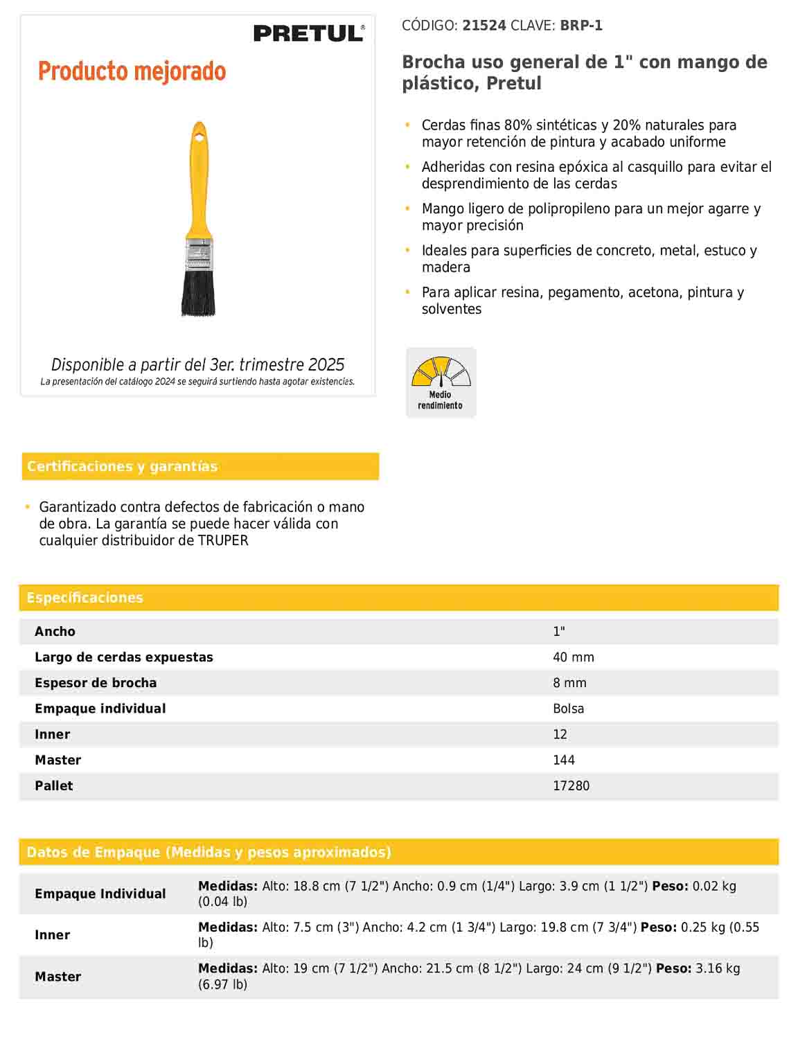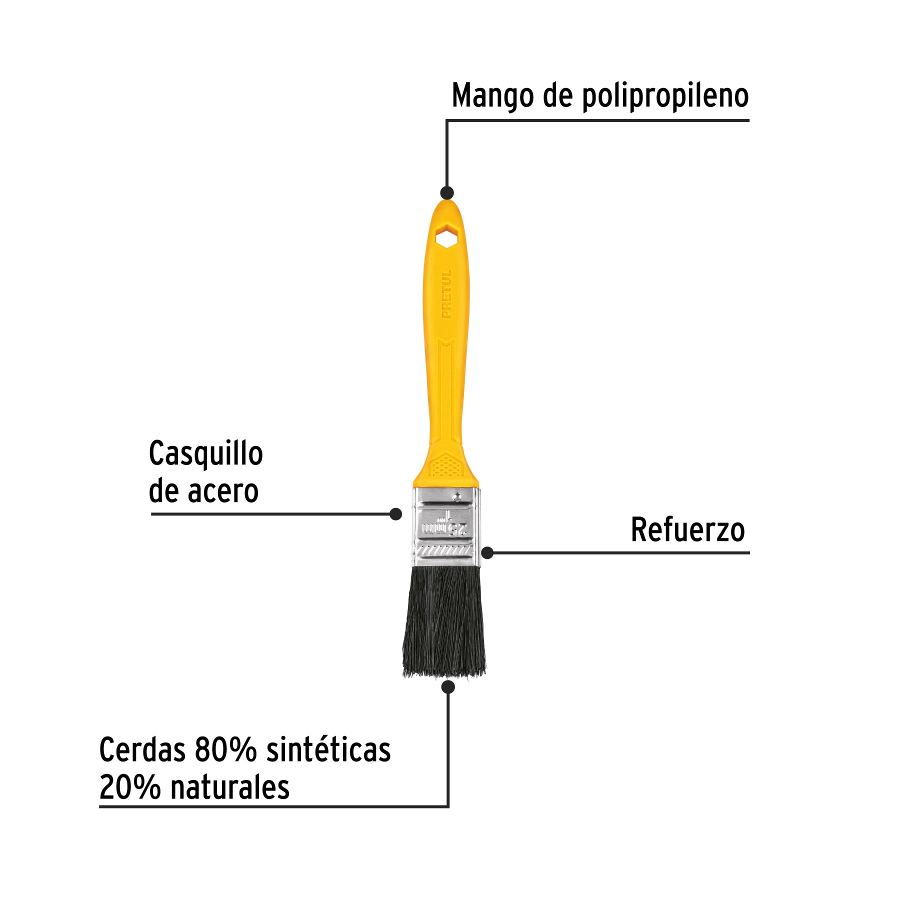 Brocha de uso general con cerdas finas 80% sintéticas y 20% naturales, que aseguran una buena retención de pintura y un acabado uniforme. Las cerdas están adheridas con resina epóxica al casquillo para evitar desprendimientos, lo que aumenta su durabilidad. El mango de polipropileno es ligero y ergonómico, ofreciendo un agarre cómodo y mayor precisión. Ideal para aplicar pintura, resina, pegamento, acetona o solventes en superficies de concreto, metal, estuco y madera.