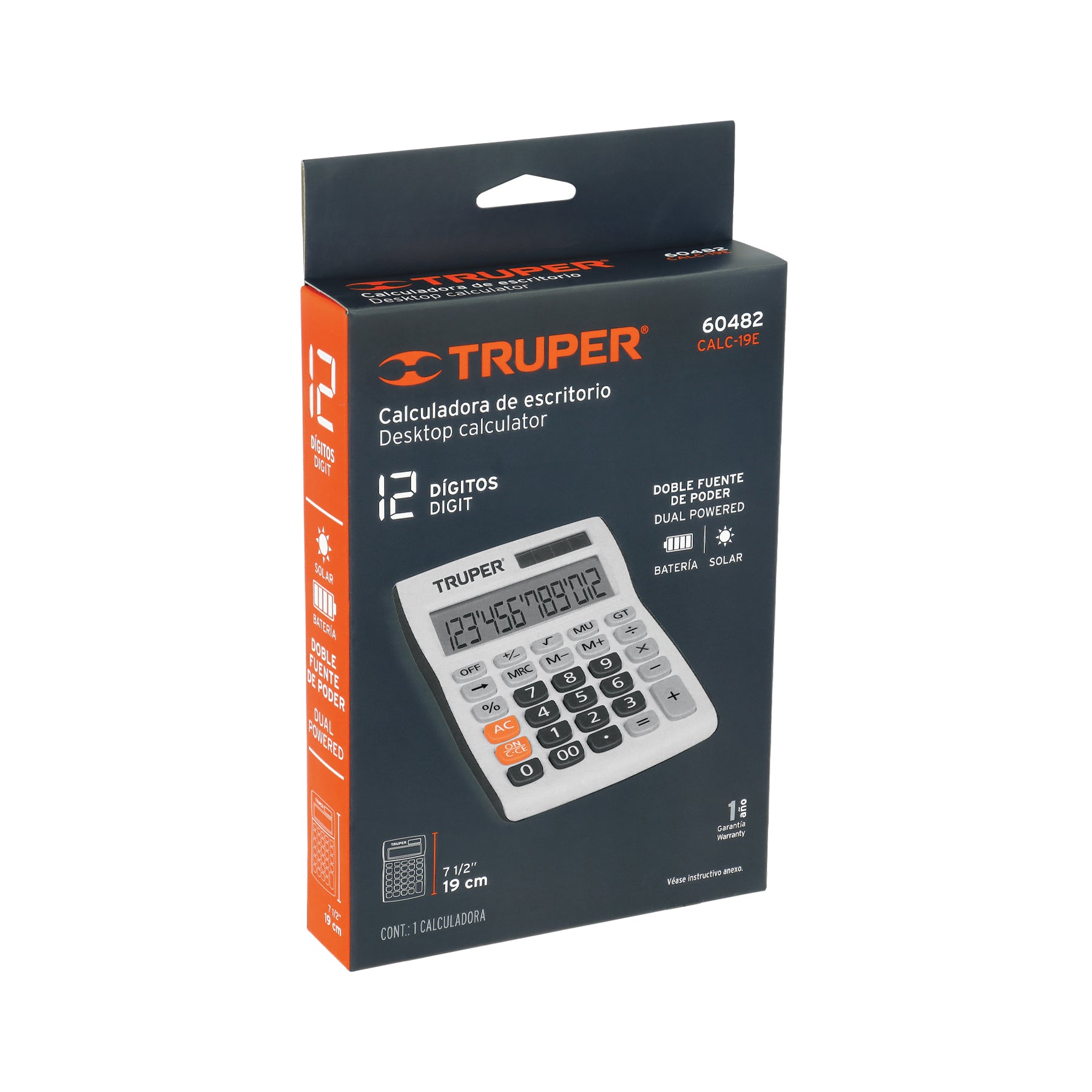 Calculadora de escritorio fabricada en ABS para mayor resistencia, equipada con pantalla de 12 dígitos y doble fuente de alimentación: solar y pila. Incluye pila alcalina tipo botón LR44 y está diseñada para uso continuo en oficina o estudio, cumpliendo con la norma NOM-016-SCFI.