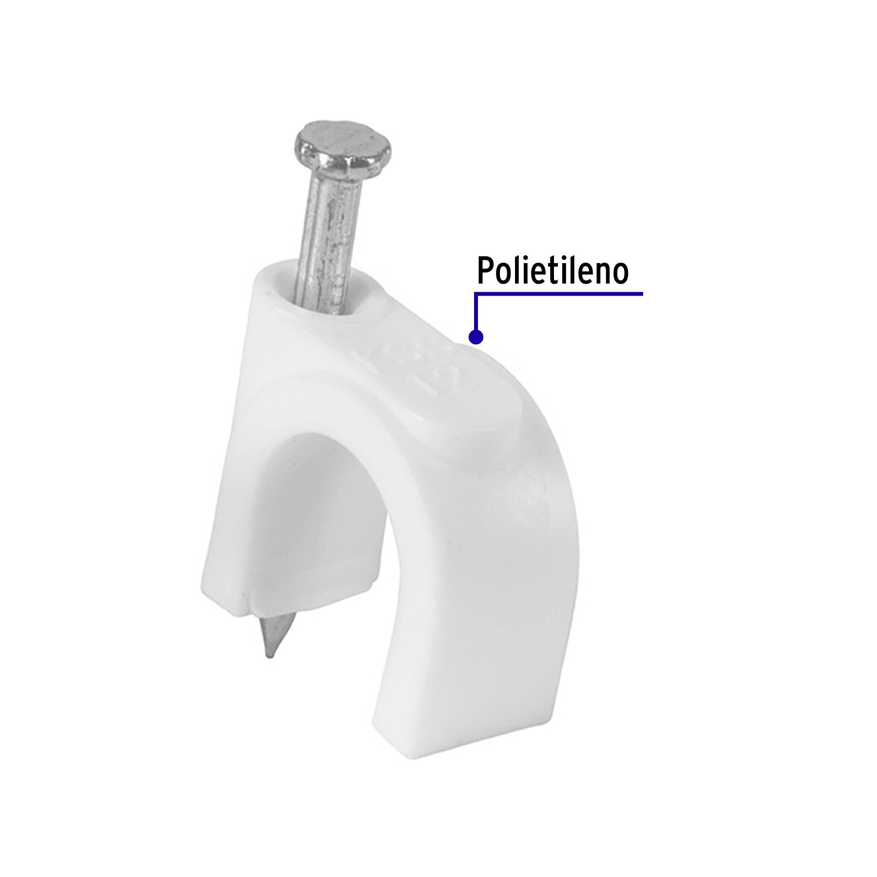 Estas grapas están diseñadas para la sujeción segura de cables redondos, como cables coaxiales, ayudando a mantener instalaciones ordenadas y bien fijadas. Están fabricadas en polietileno e incluyen clavo metálico integrado, lo que permite una instalación práctica y confiable en superficies sólidas.