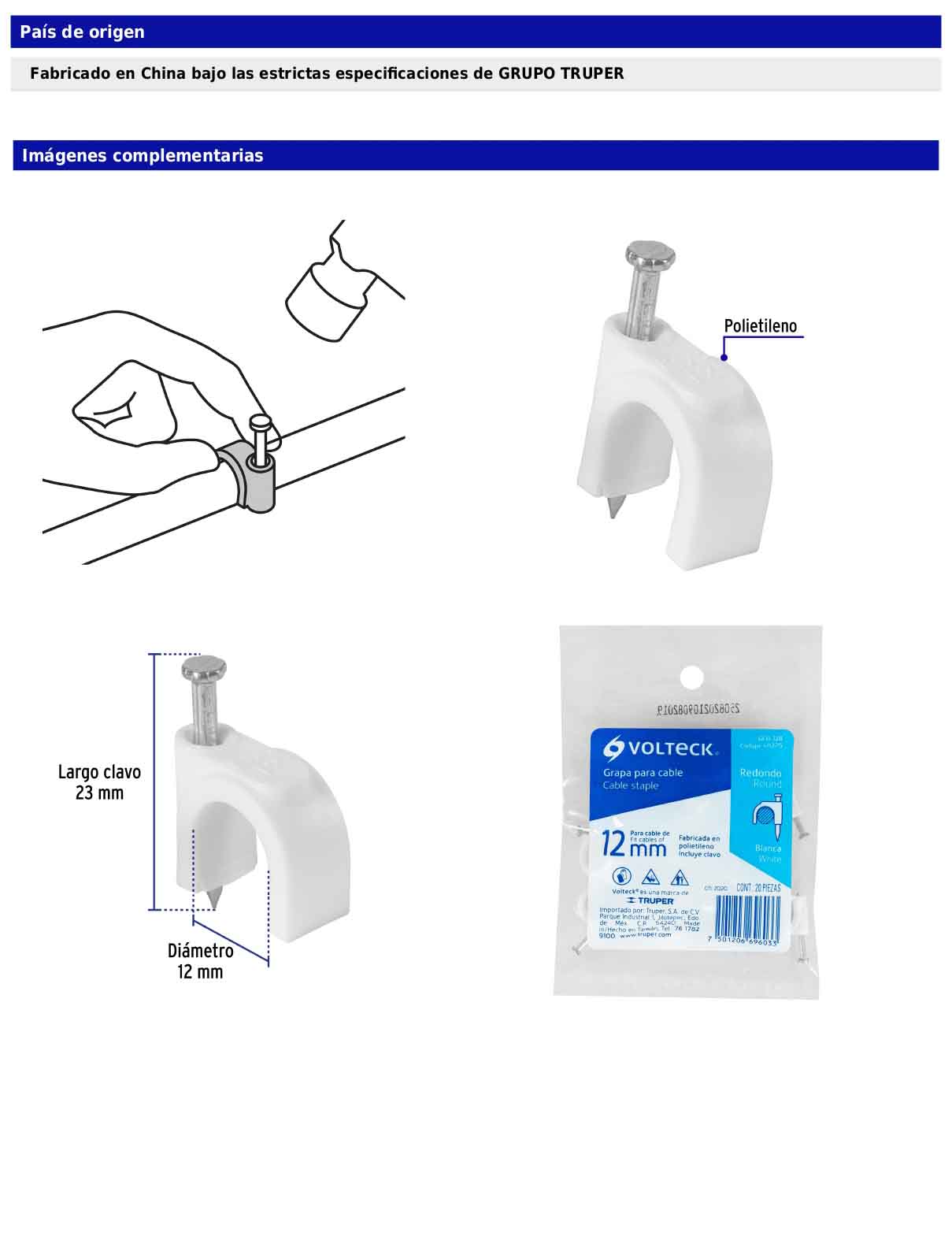 Estas grapas están diseñadas para la sujeción segura de cables redondos, como cables coaxiales, ayudando a mantener instalaciones ordenadas y bien fijadas. Están fabricadas en polietileno e incluyen clavo metálico integrado, lo que permite una instalación práctica y confiable en superficies sólidas.