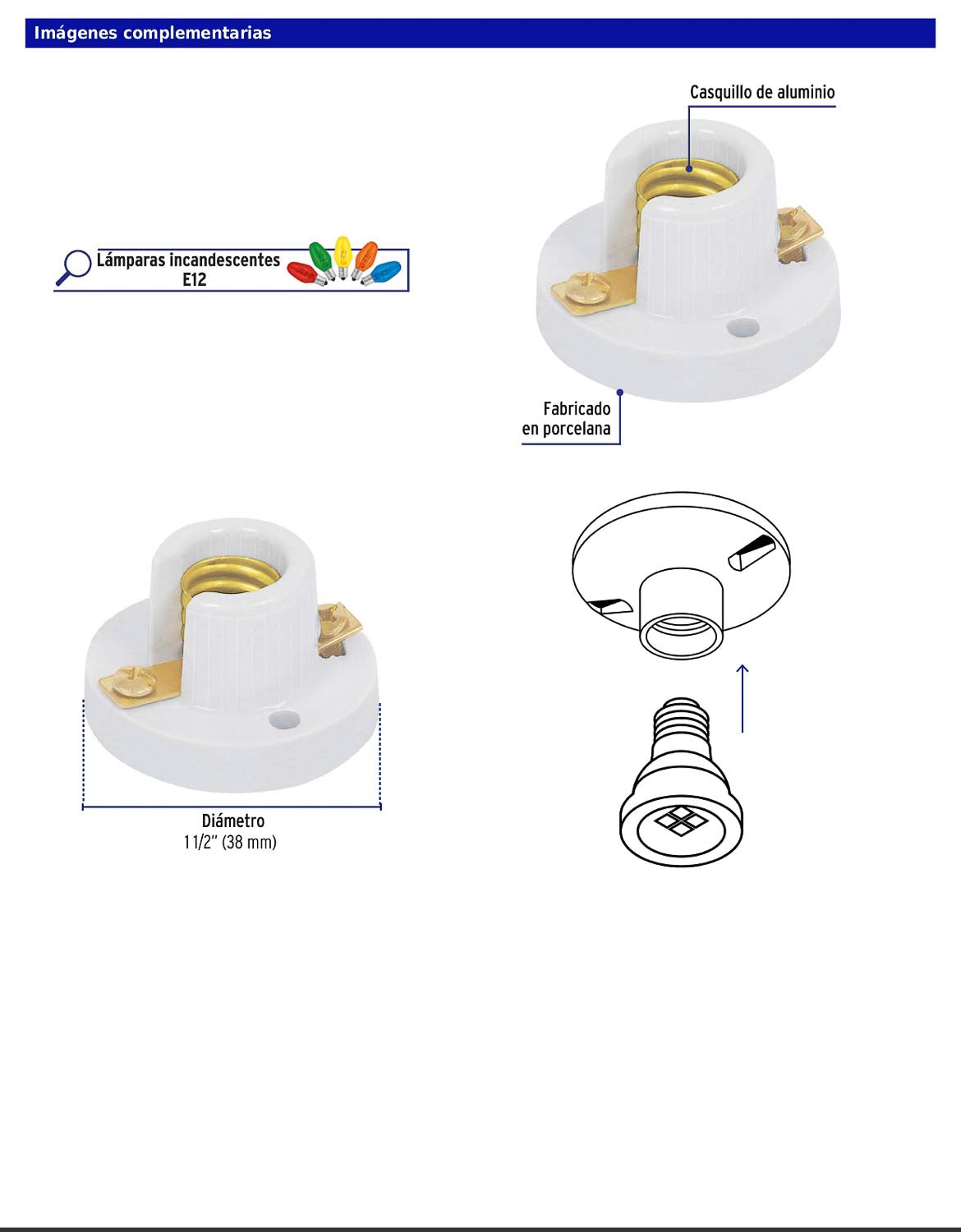 Portalámpara de porcelana diseñado para candil, ideal para instalación en pared o techo con base redonda atornillable de sobreponer. Cuenta con casquillo de aluminio, base E12 y soporta temperaturas elevadas de hasta 350 °C, operando a 125 V y 4 A para un uso seguro y confiable.