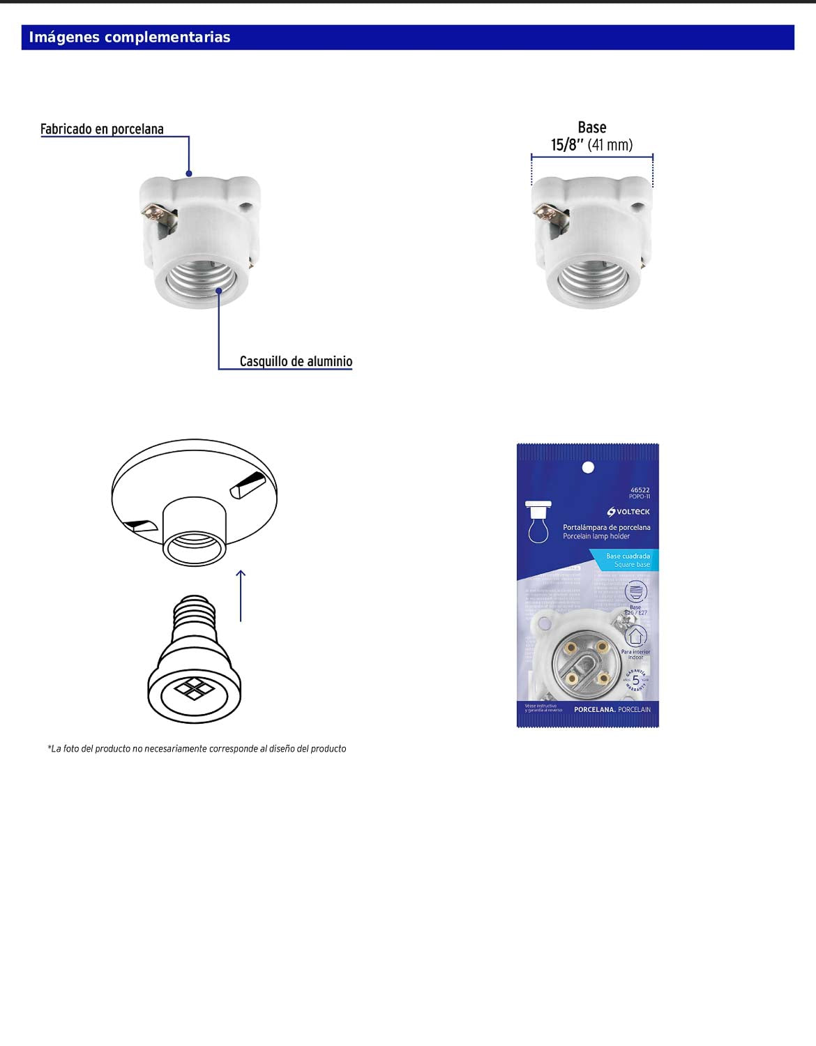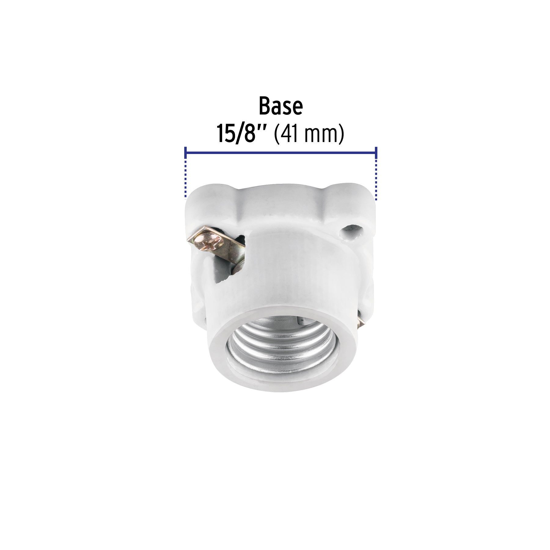 Portalámpara de porcelana diseñado para fijación en pared o techo mediante base cuadrada atornillable de sobreponer, ideal para instalaciones seguras y resistentes. Cuenta con casquillo de aluminio, base E26/E27 y soporta temperaturas elevadas de hasta 350 °C, operando a 120 V y 4 A para uso confiable en aplicaciones residenciales o de trabajo.