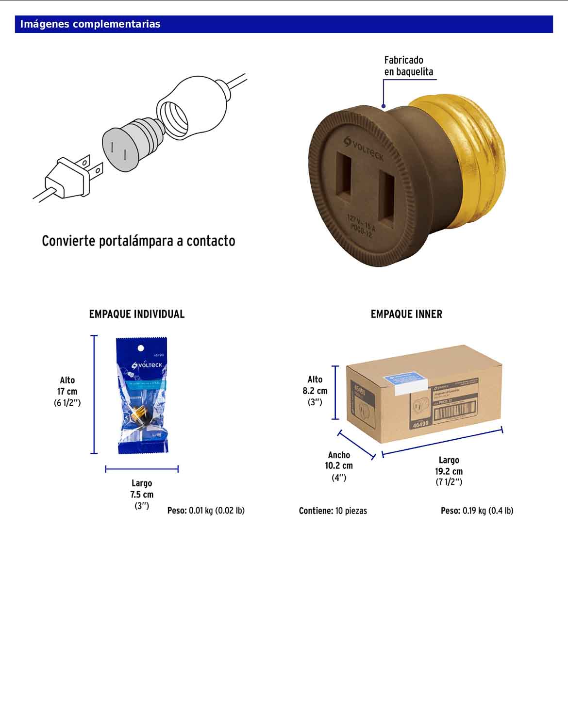 Adaptador diseñado para convertir un portalámpara en un punto de contacto, ideal para instalaciones prácticas donde se requiere una salida adicional sin modificar la instalación eléctrica. Opera a 127 V y 15 A, cuenta con base E26/E27 y está fabricado en baquelita para un uso resistente y confiable.