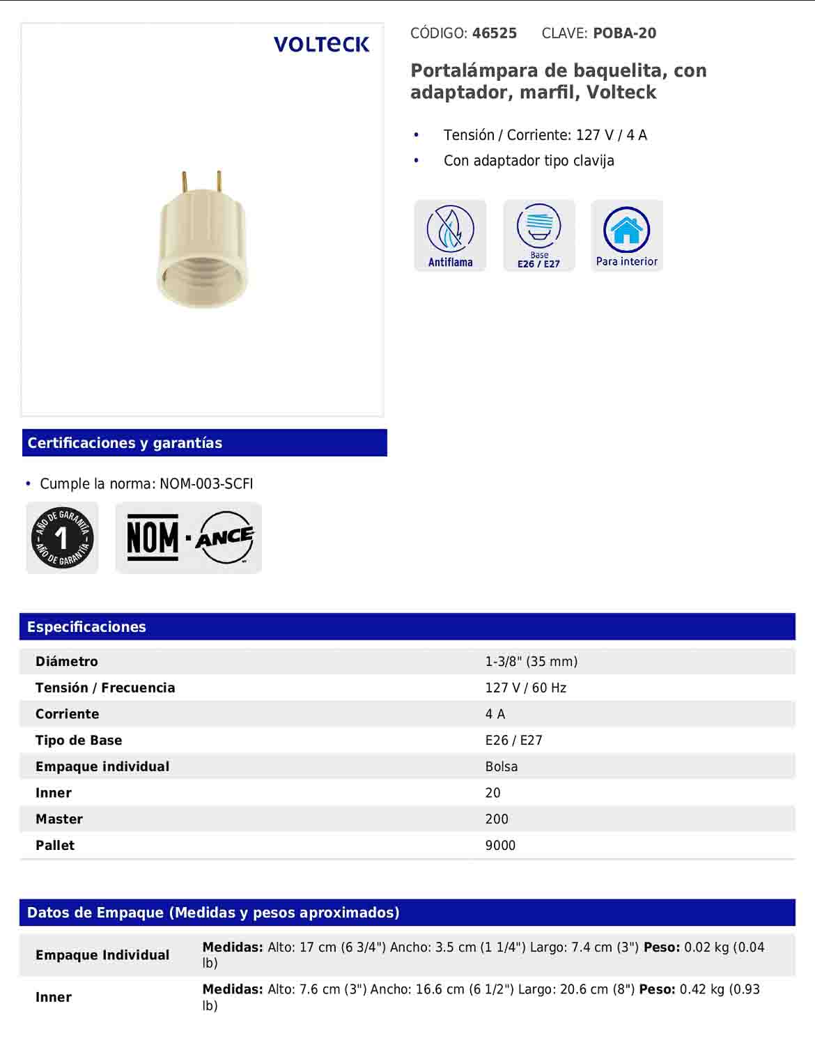 Portalámpara de baquelita con adaptador tipo clavija diseñado para una instalación práctica en conexiones compatibles. Opera a 127 V y 4 A, con base E26/E27, ideal para aplicaciones residenciales o de trabajo donde se requiere una conexión sencilla y confiable.