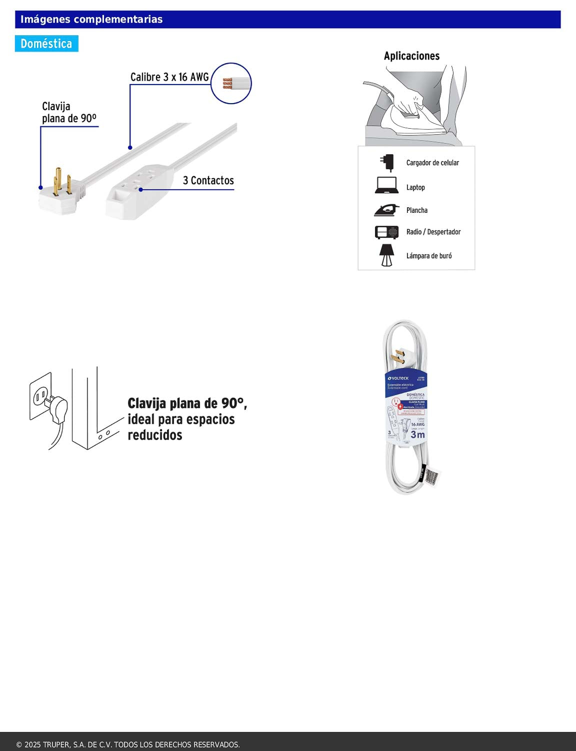 Extensión doméstica recomendada para equipos y electrodomésticos en instalaciones que cuentan con tierra física. Ofrece capacidad para conectar hasta tres clavijas y está fabricada con materiales resistentes a la propagación de la flama. Su clavija plana de 90° permite un uso eficiente en espacios reducidos. Cumple con la norma NOM-003-SCFI.