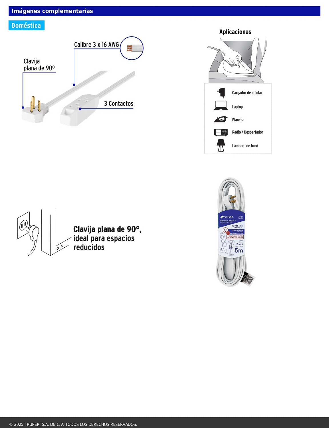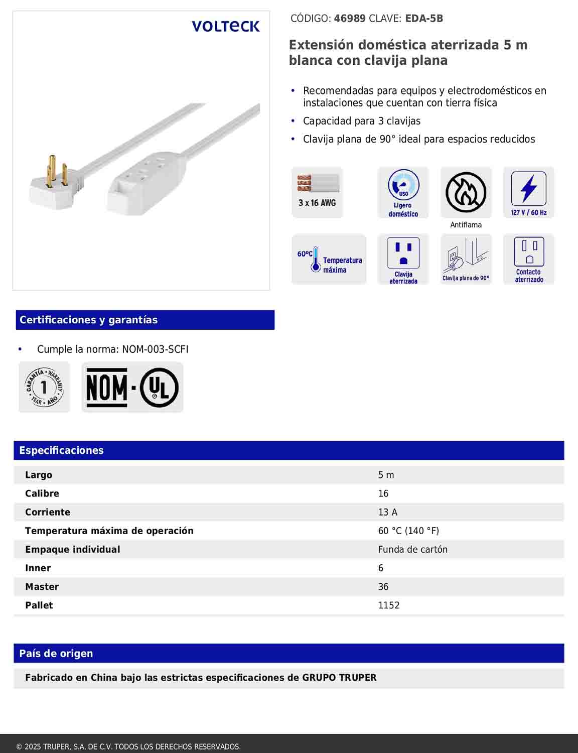 Extensión doméstica diseñada para instalaciones que cuentan con tierra física. Ofrece capacidad para conectar hasta tres clavijas y está fabricada con materiales resistentes a la propagación de la flama. Su clavija plana de 90° permite un uso más eficiente en espacios reducidos. Cumple con la norma NOM-003-SCFI.
