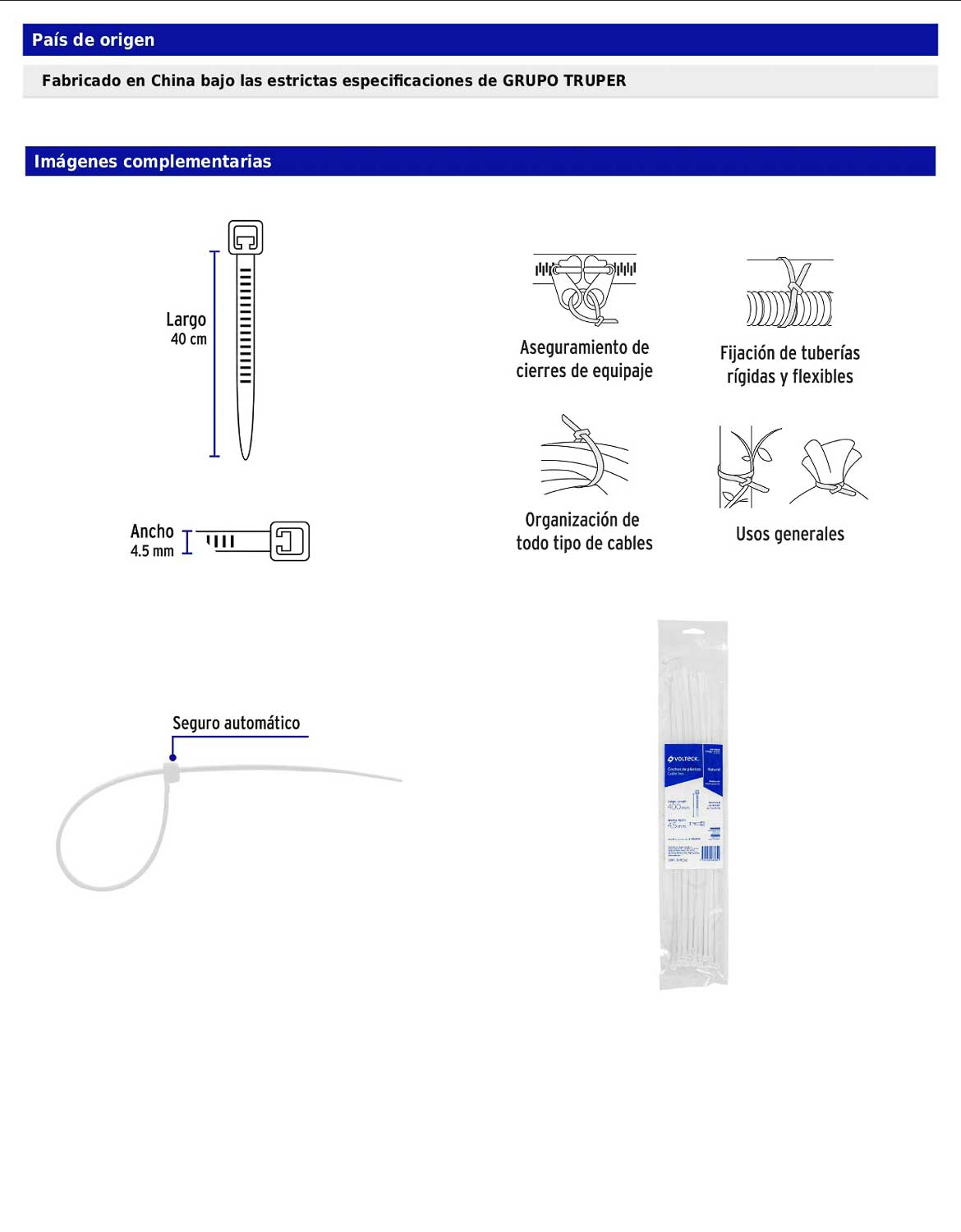 Cinchos plásticos fabricados en nylon con seguro automático, útiles para sujetar, amarrar y ordenar cables eléctricos u otro tipo de objetos. Son adecuados para organización de todo tipo de cables y usos generales.