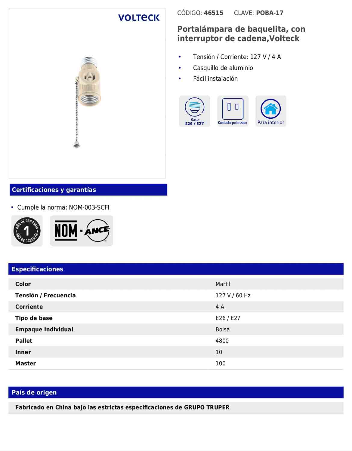 Portalámpara de baquelita diseñado para instalaciones prácticas y seguras, ideal para uso residencial o de trabajo. Incluye interruptor de cadena para encendido y apagado, casquillo de aluminio y base compatible E26/E27, con operación a 127 V para un uso confiable en distintas aplicaciones.