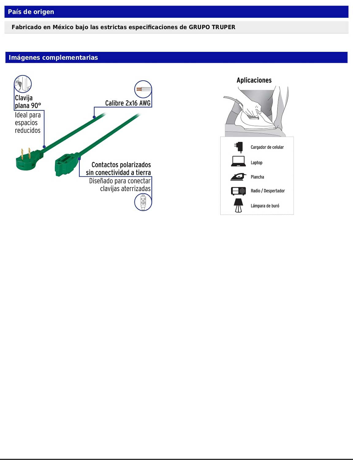 Extensión eléctrica diseñada para uso en interiores, fabricada con recubrimiento de PVC resistente a la propagación de la flama. Cuenta con tres contactos polarizados y un diseño que permite conectar clavijas aterrizadas. Su clavija plana de 90° facilita su uso en espacios reducidos. Cumple con la norma NOM-003-SCFI.