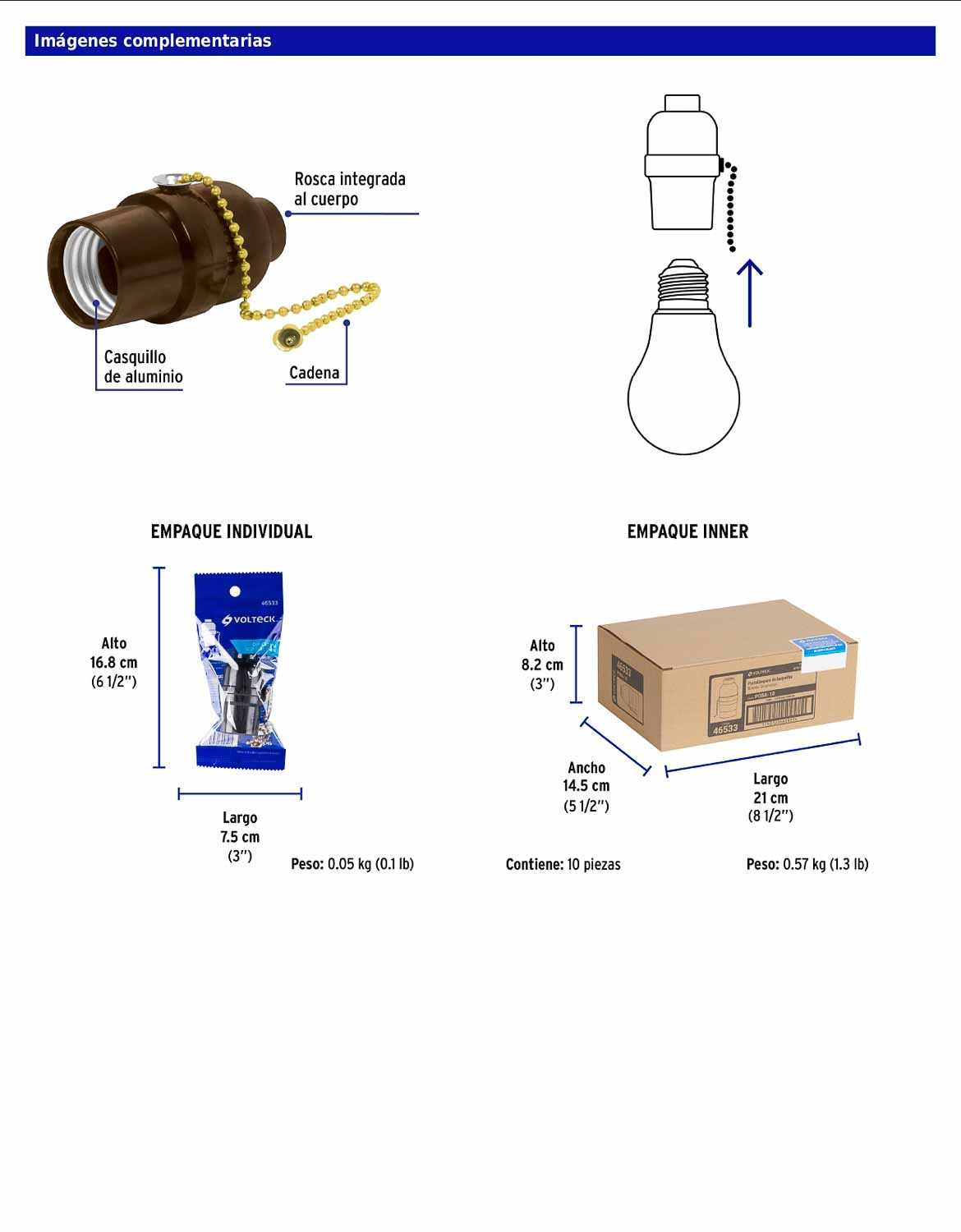 Portalámpara de baquelita diseñado para instalaciones prácticas y seguras, ideal para uso residencial o de trabajo. Cuenta con interruptor de cadena para encendido y apagado, casquillo de aluminio, base compatible E26/E27 y operación a 125 V, facilitando una instalación sencilla en distintos tipos de aplicaciones.