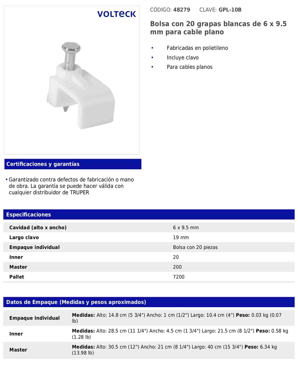 Estas grapas están diseñadas para la sujeción segura de cables planos sobre superficies sólidas, ayudando a mantener instalaciones ordenadas y bien fijadas. Están fabricadas en polietileno e incluyen clavo metálico integrado, lo que facilita una instalación rápida y firme.