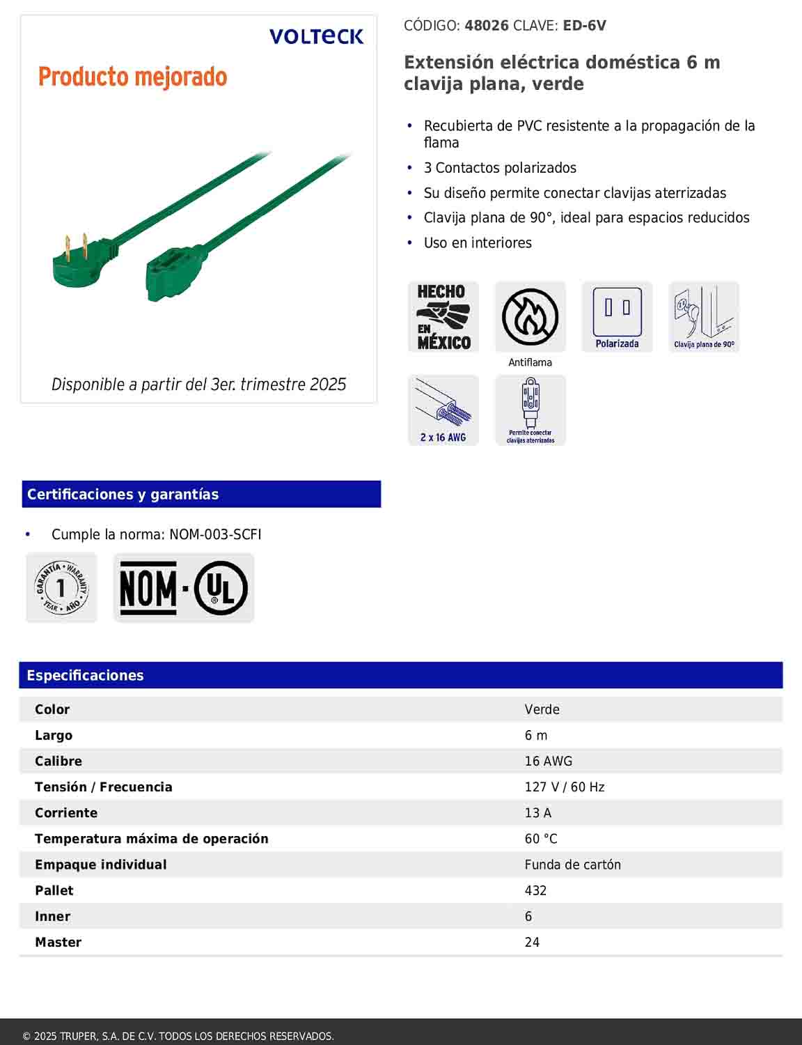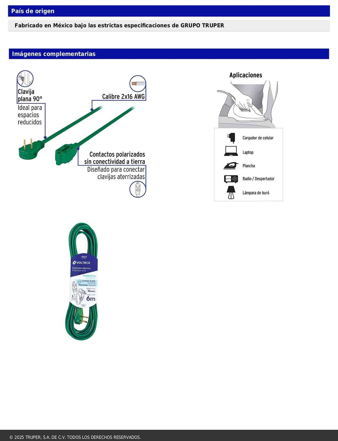 Extensión eléctrica diseñada para uso en interiores, recubierta con PVC resistente a la propagación de la flama. Cuenta con tres contactos polarizados y un diseño que permite conectar clavijas aterrizadas. Su clavija plana de 90° facilita el uso en espacios reducidos. Cumple con la norma NOM-003-SCFI.