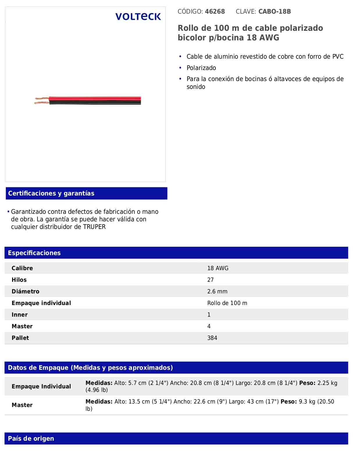 Su presentación en rollo de 100 metros facilita instalaciones continuas en proyectos residenciales o comerciales, manteniendo un calibre adecuado para transmisión de señal de audio.