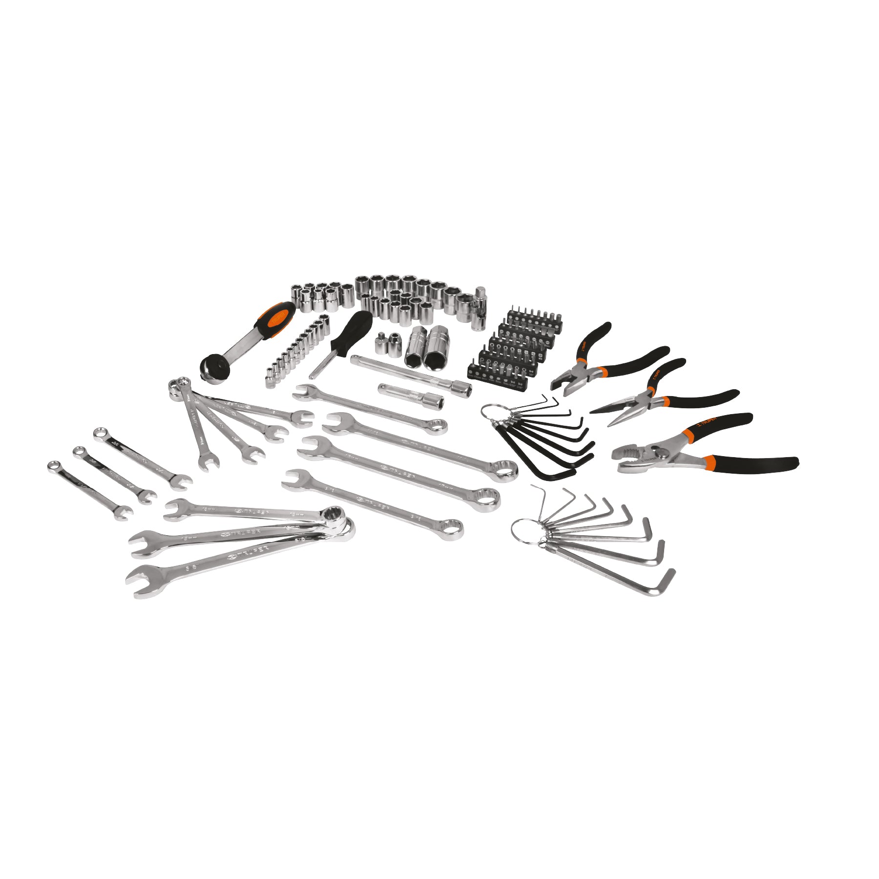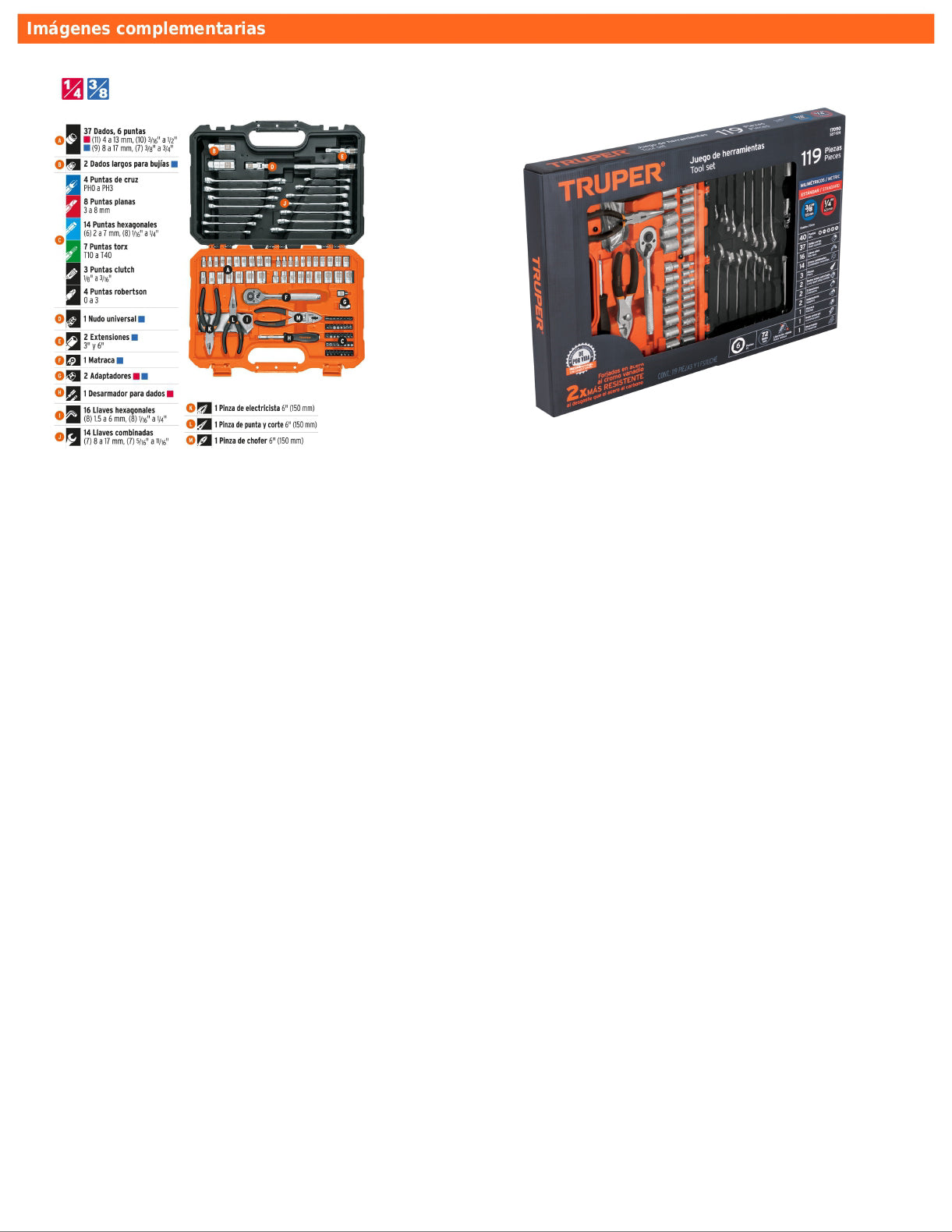 Este juego de 119 piezas está pensado para trabajos mecánicos completos y versátiles, ya que combina cuadrantes de 1/4" y 3/8" con herramientas mixtas en medidas estándar y milimétricas. Sus dados y accesorios están fabricados en acero al cromo vanadio, ofreciendo resistencia y buen desempeño para mantenimiento general y uso frecuente.