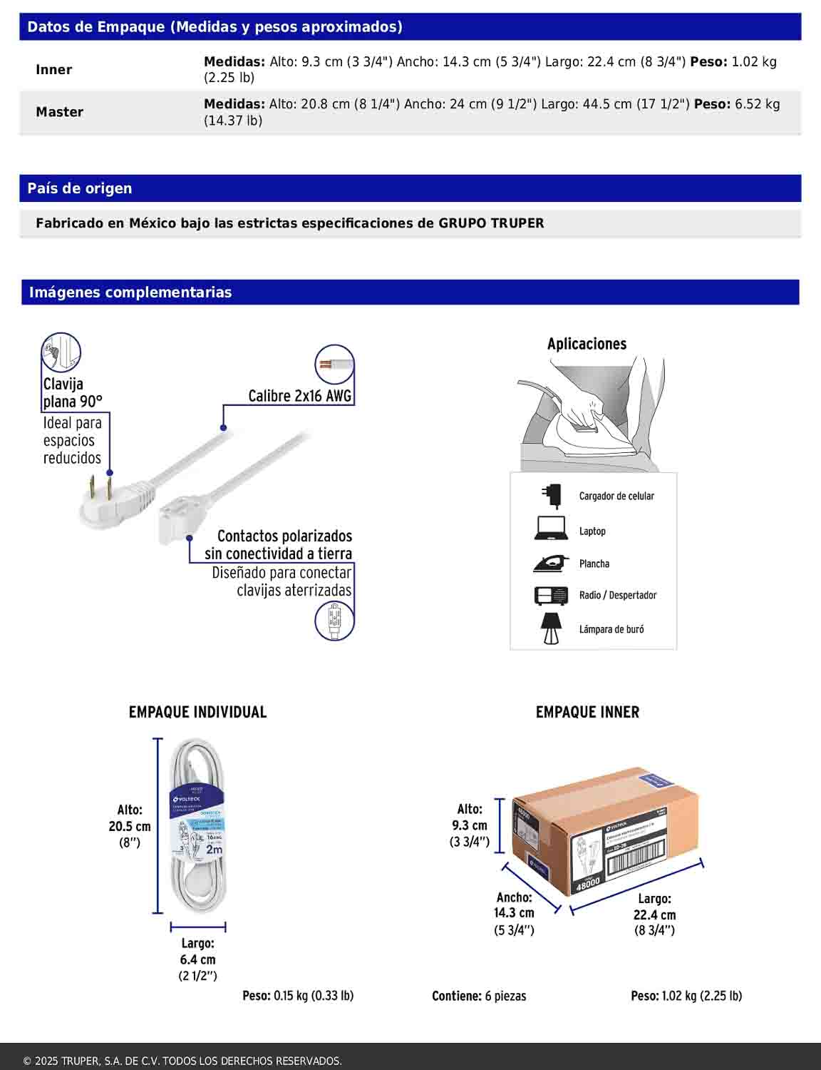 Extensión eléctrica para uso en interiores fabricada con recubrimiento de PVC resistente a la propagación de la flama. Incluye tres contactos polarizados y un diseño que permite conectar clavijas aterrizadas. Su clavija plana de 90° facilita el uso en espacios reducidos. Cumple con la norma NOM-003-SCFI.