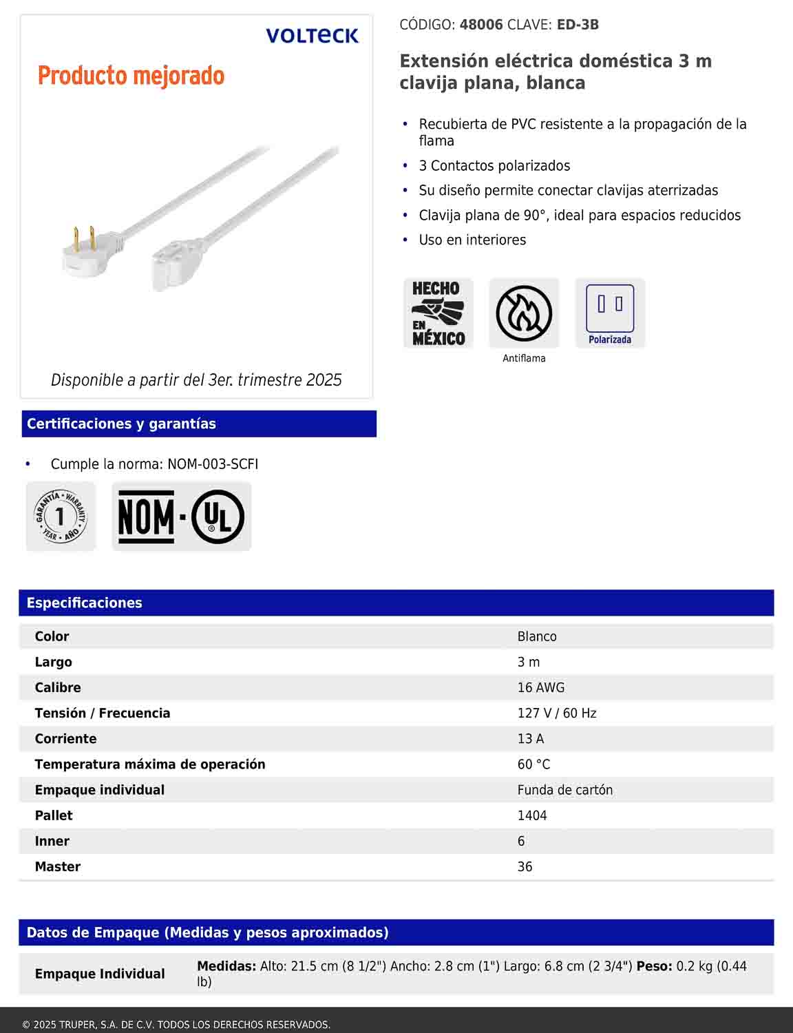 Extensión eléctrica para interiores recubierta de PVC resistente a la propagación de la flama. Incluye tres contactos polarizados y un diseño que permite conectar clavijas aterrizadas. Su clavija plana de 90° permite un uso eficiente en espacios reducidos. Cumple con la norma NOM-003-SCFI.