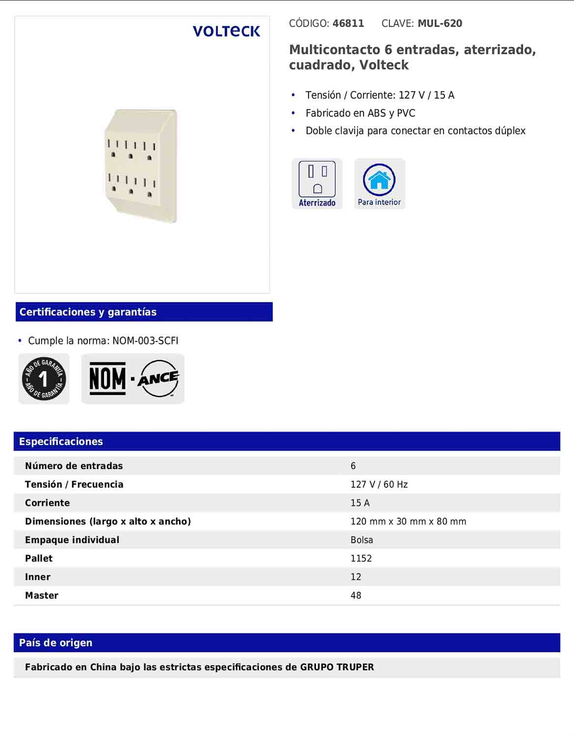Multicontacto cuadrado de 6 entradas con conexión a tierra, ideal para ampliar conexiones en un solo punto. Su doble clavija permite conectarlo en contactos dúplex y está fabricado en ABS y PVC para un uso confiable en casa u oficina.