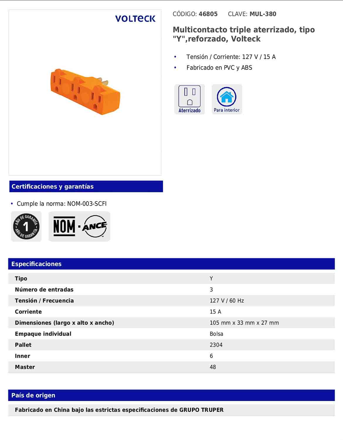 Multicontacto triple aterrizado tipo Y reforzado, ideal para ampliar conexiones en un solo punto con un diseño práctico. Está fabricado en PVC y ABS, y cumple con la norma NOM-003-SCFI para un uso confiable en casa u oficina.