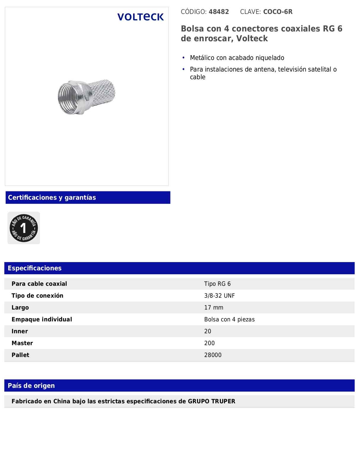 Gracias a su compatibilidad con rosca estándar 3/8-32 UNF, estos conectores permiten una correcta sujeción del cable coaxial, ayudando a mantener una transmisión estable de la señal en aplicaciones residenciales o comerciales.