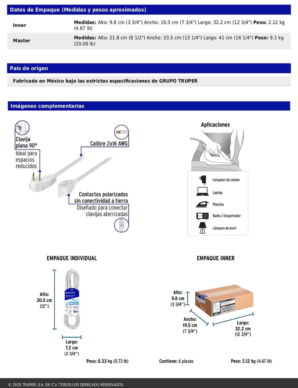 Extensión eléctrica diseñada para uso en interiores, fabricada con recubrimiento de PVC resistente a la propagación de la flama. Cuenta con tres contactos polarizados y un diseño que permite conectar clavijas aterrizadas. Su clavija plana de 90° es ideal para espacios reducidos y cumple la norma NOM-003-SCFI.