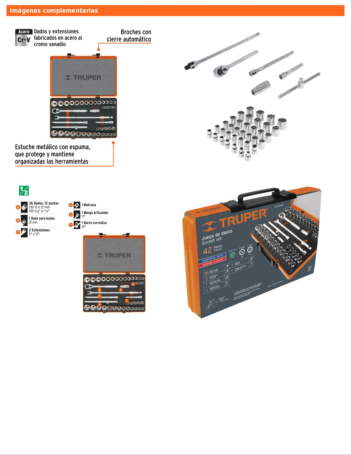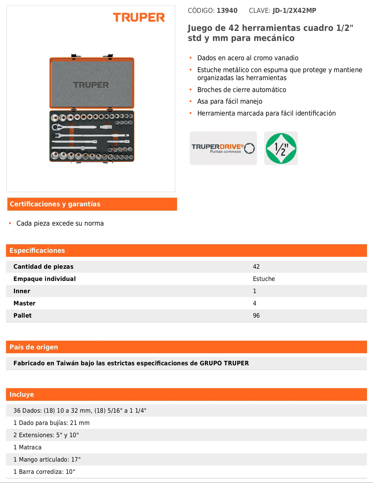 Este juego de 42 piezas en cuadro 1/2" combina medidas estándar y milimétricas para trabajos mecánicos de mantenimiento y reparación. Sus dados están fabricados en acero al cromo vanadio, por lo que ofrecen buena resistencia y desempeño para uso frecuente.