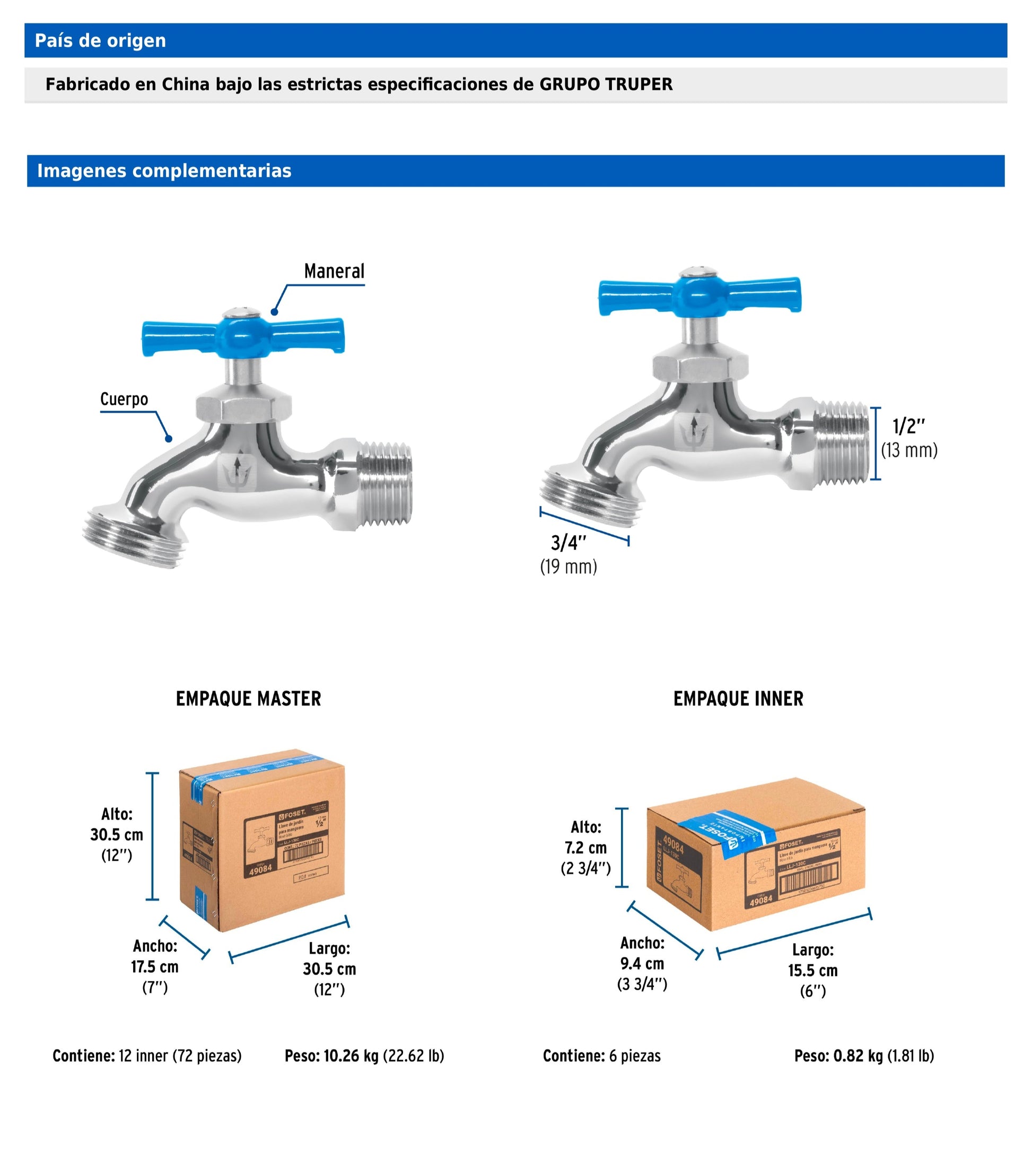 Fabricada en latón cromado para máxima duración, con acabado cromo, maneral metálico y cierre de compresión. Diseñada para jardín y tomas de agua.