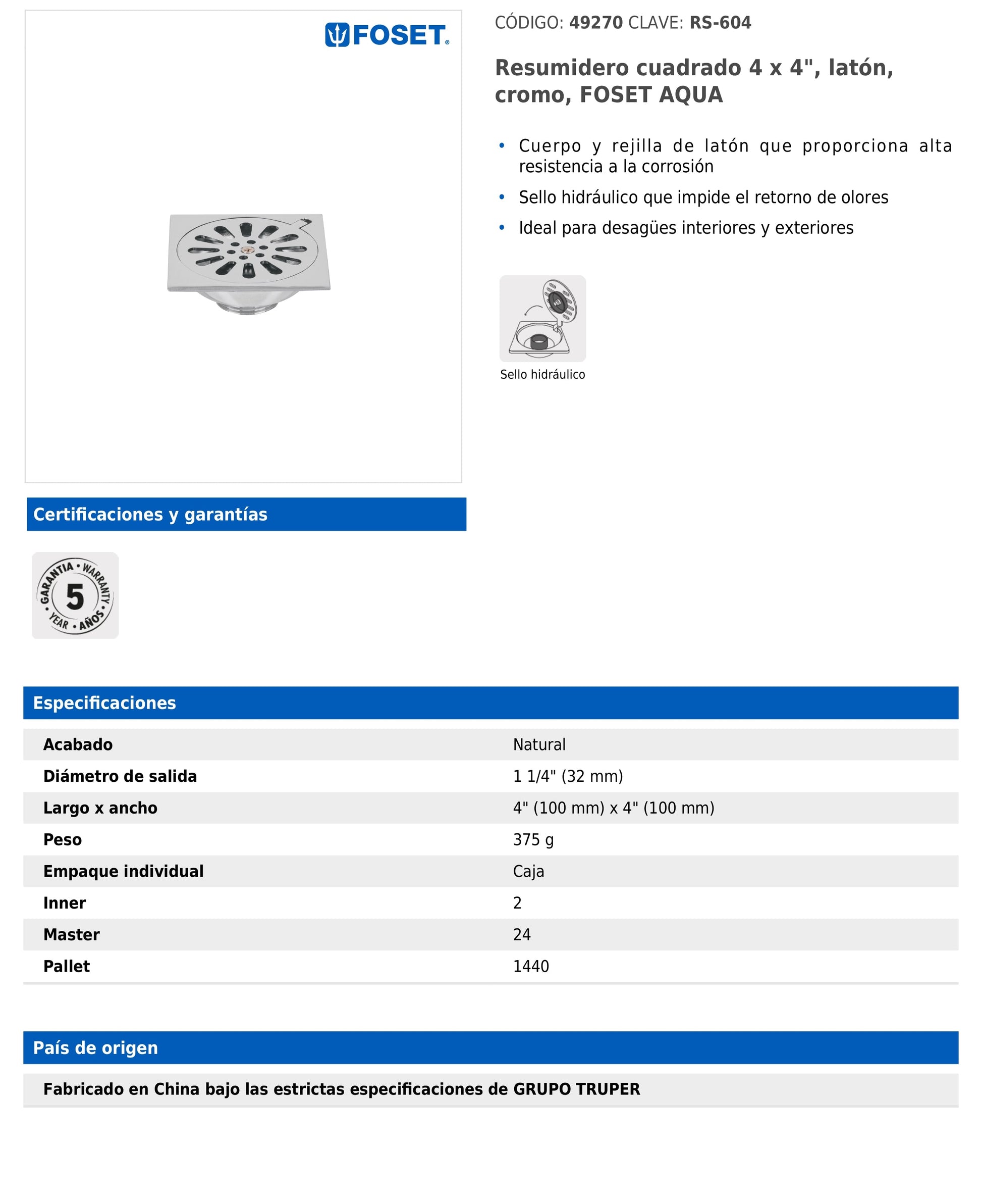 Fabricado con cuerpo y rejilla de latón cromado, proporciona excelente resistencia a la corrosión. Su sello hidráulico impide el retorno de olores. Ideal para desagües tanto interiores como exteriores.