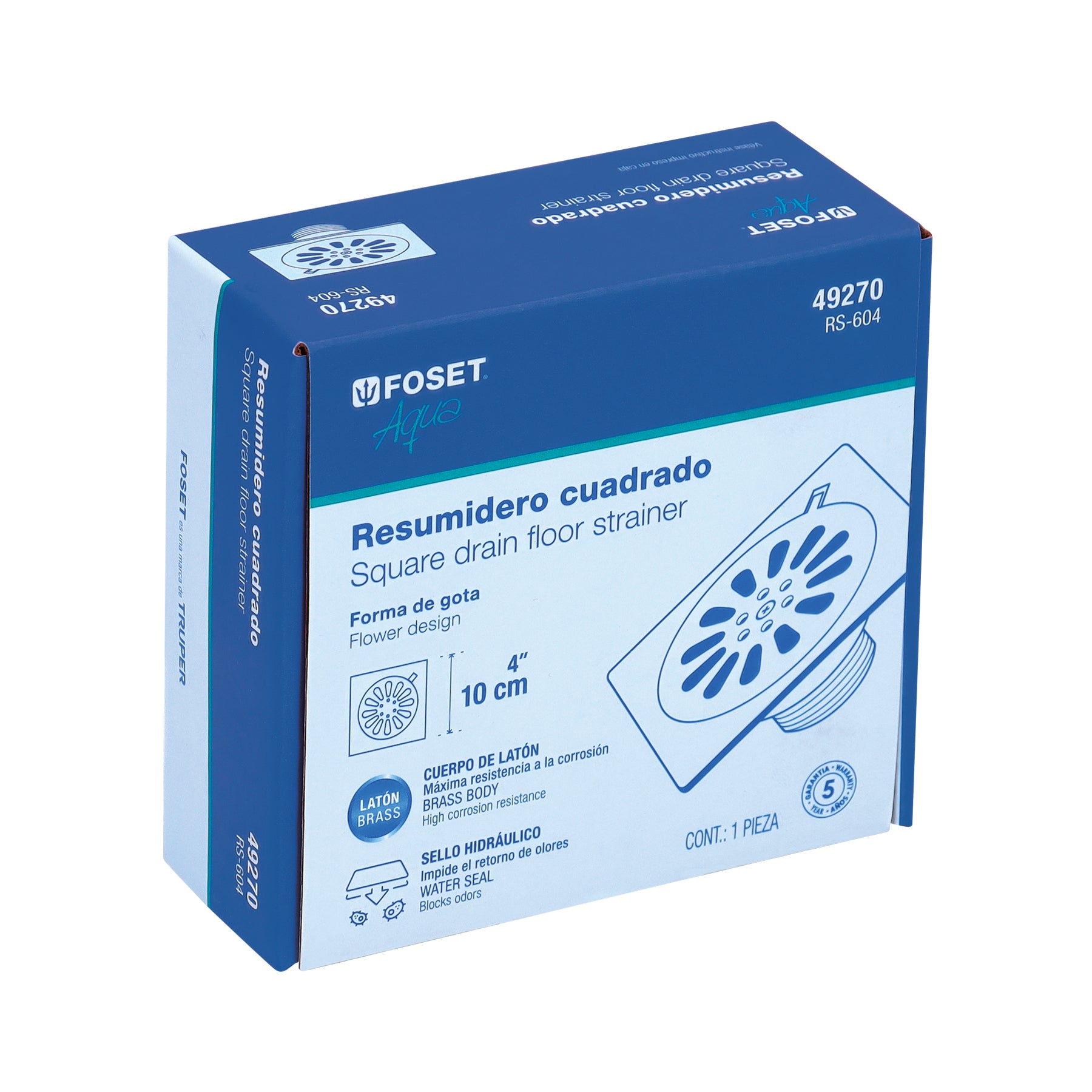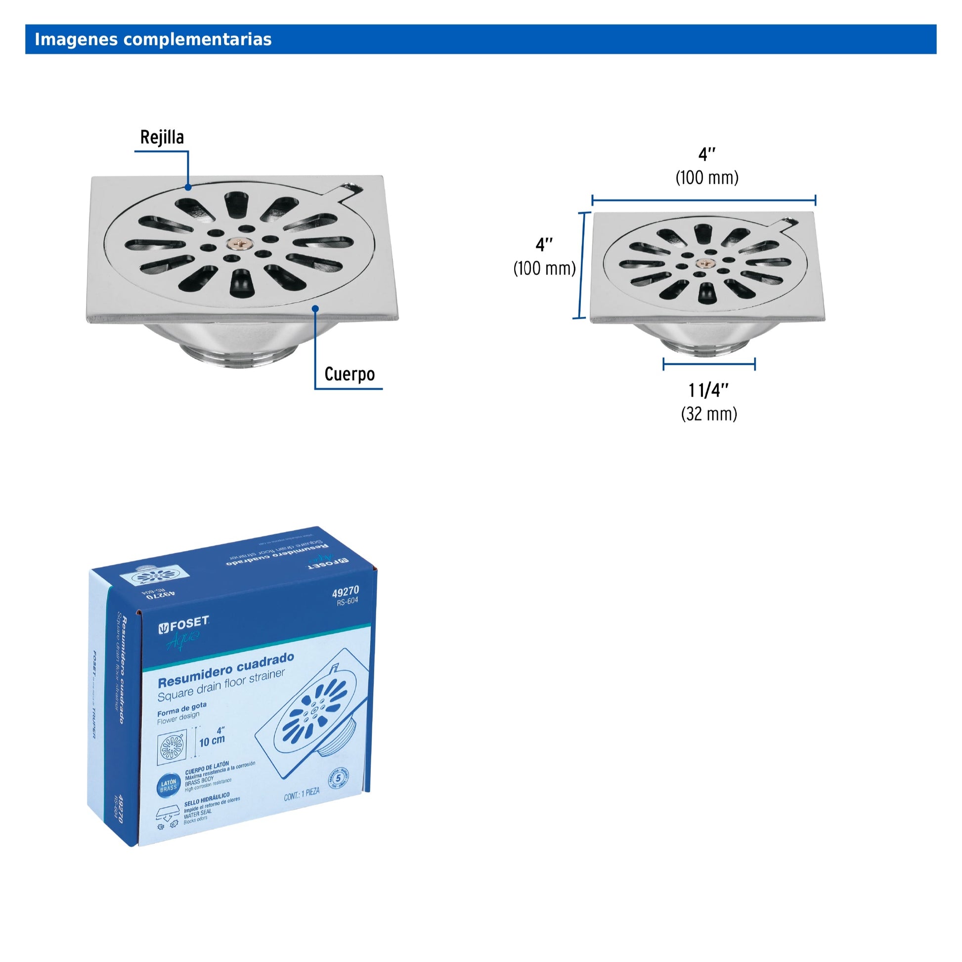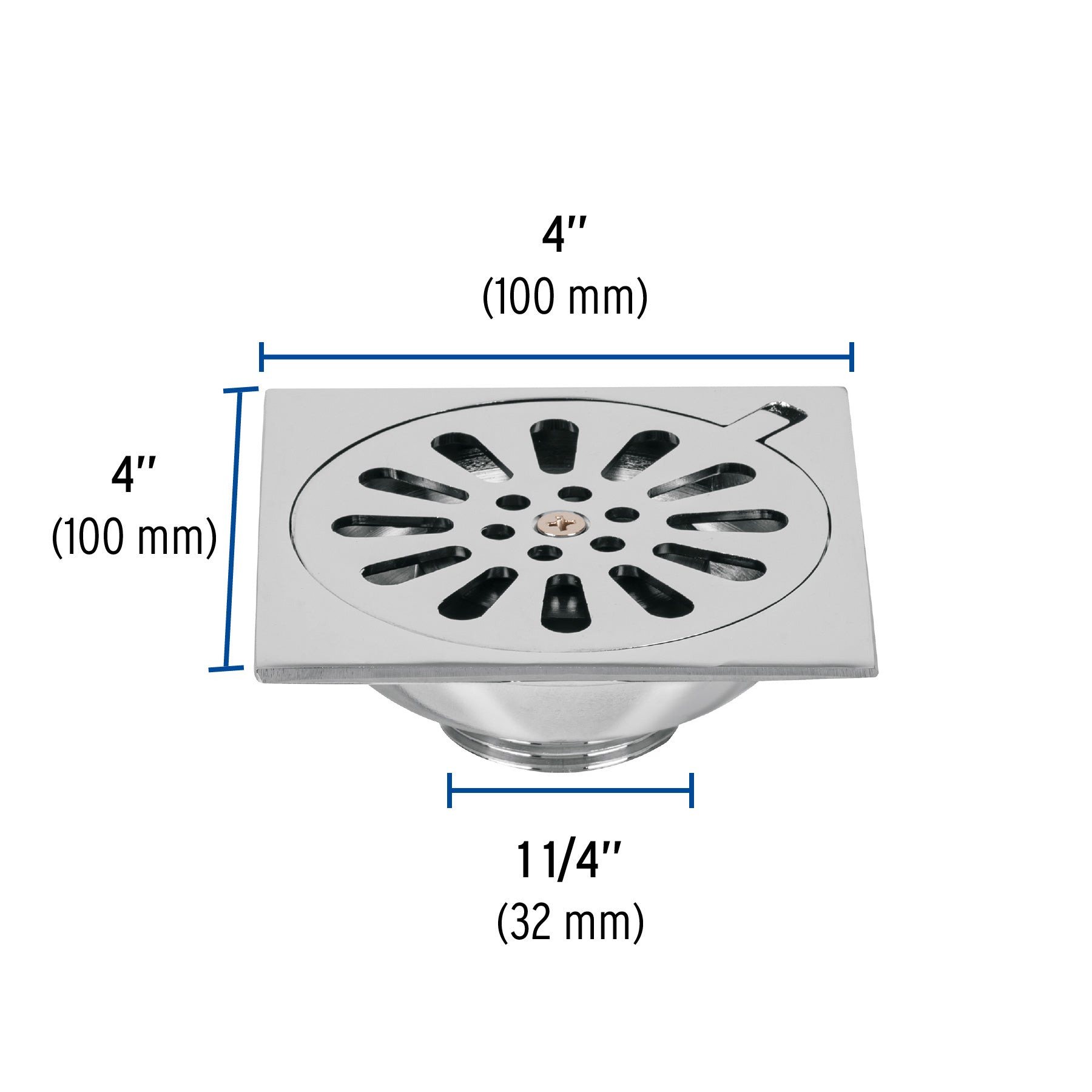 Resumidero cuadrado de 4" x 4" en latón cromado con sello hidráulico