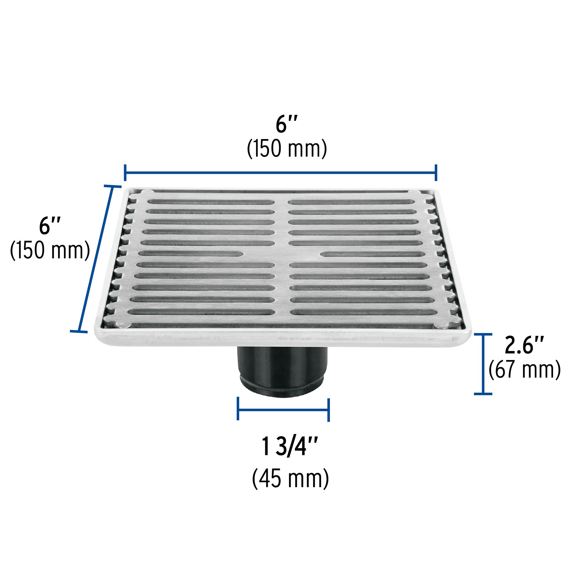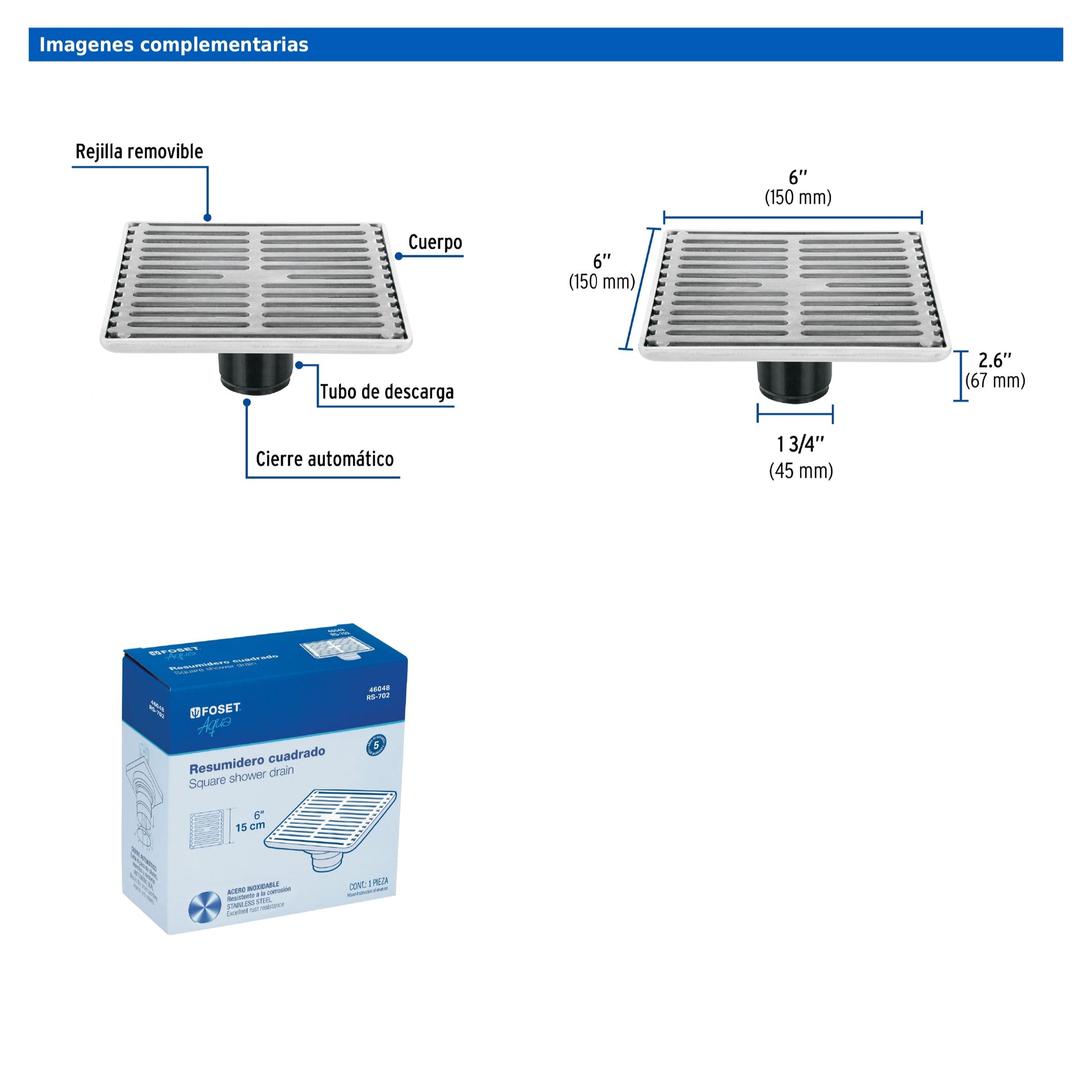 Resumidero cuadrado de 6" x 6" en acero inoxidable con cierre automático