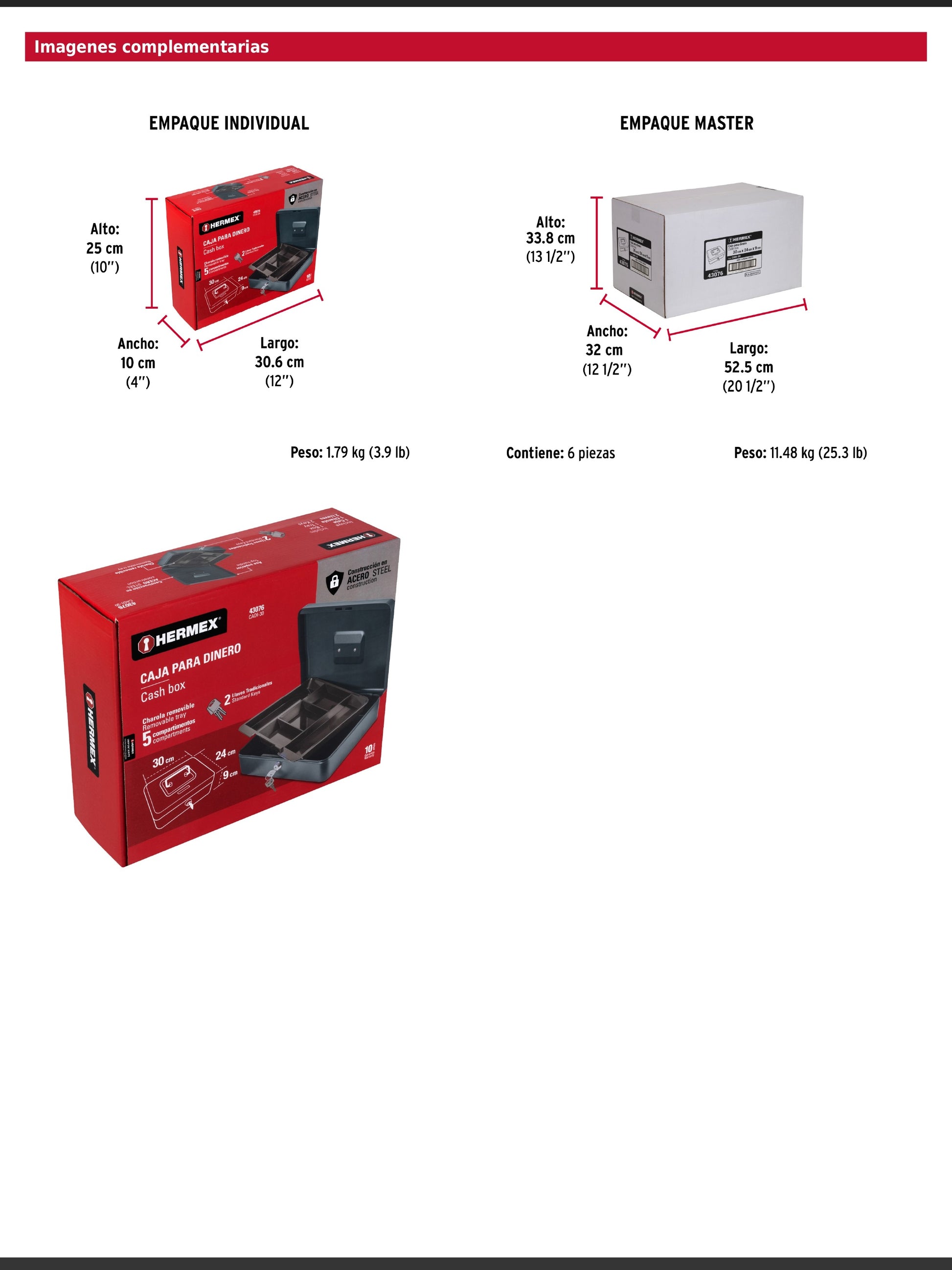 Caja fabricada en acero con charola removible que cuenta con 5 separadores para monedas y billetes. Incorpora agarradera superior que facilita su transporte e incluye 2 llaves para mayor seguridad.