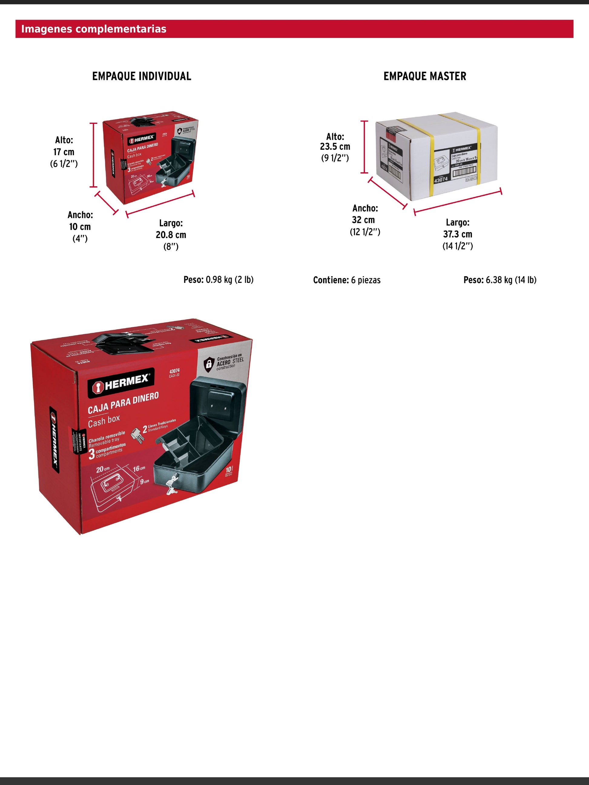Caja fabricada en acero con charola removible que incluye 3 separadores para monedas y billetes. Cuenta con agarradera superior que facilita su transporte e incluye 2 llaves para mayor seguridad.