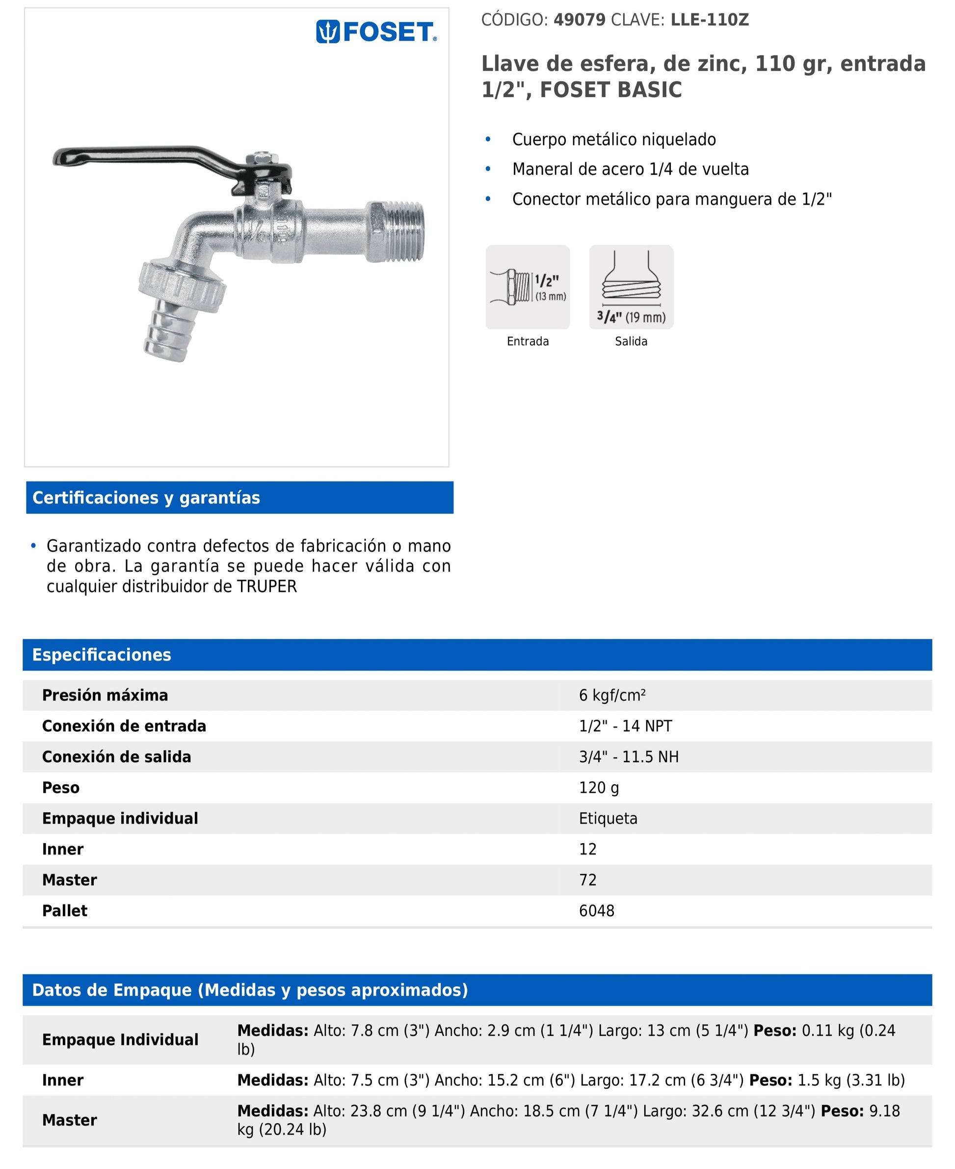 Llave de esfera de zinc de 110 g con entrada de 1/2 pulgada