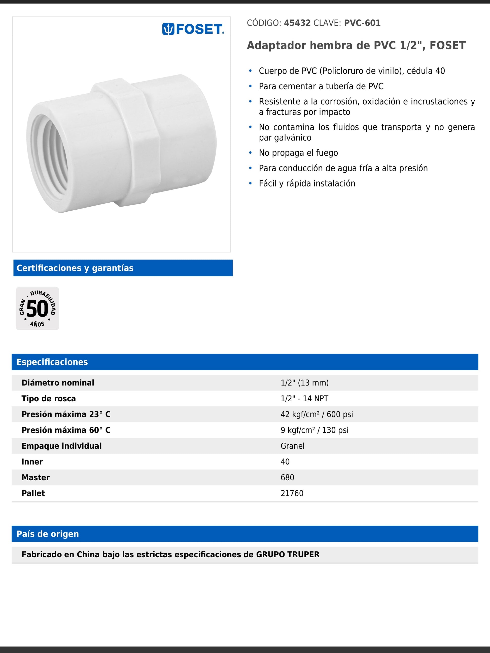 Adaptador hembra fabricado en PVC cédula 40, diseñado para cementar a tubería de PVC. Ofrece gran resistencia a la corrosión, oxidación, incrustaciones y fracturas por impacto. No contamina los fluidos que transporta, no genera par galvánico ni propaga el fuego. Su instalación es fácil y rápida, ideal para conducción de agua fría a alta presión.