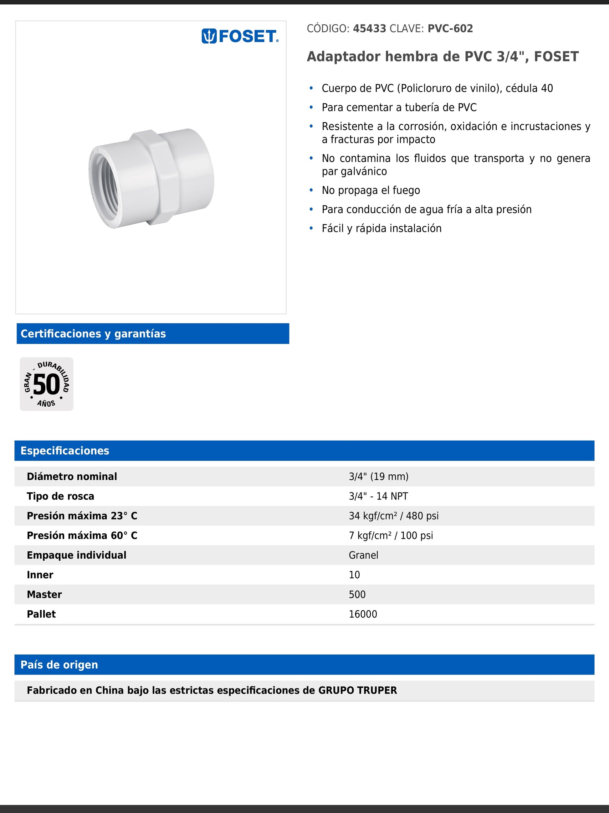 Adaptador hembra de PVC cédula 40 de 3/4 pulgada con rosca NPT