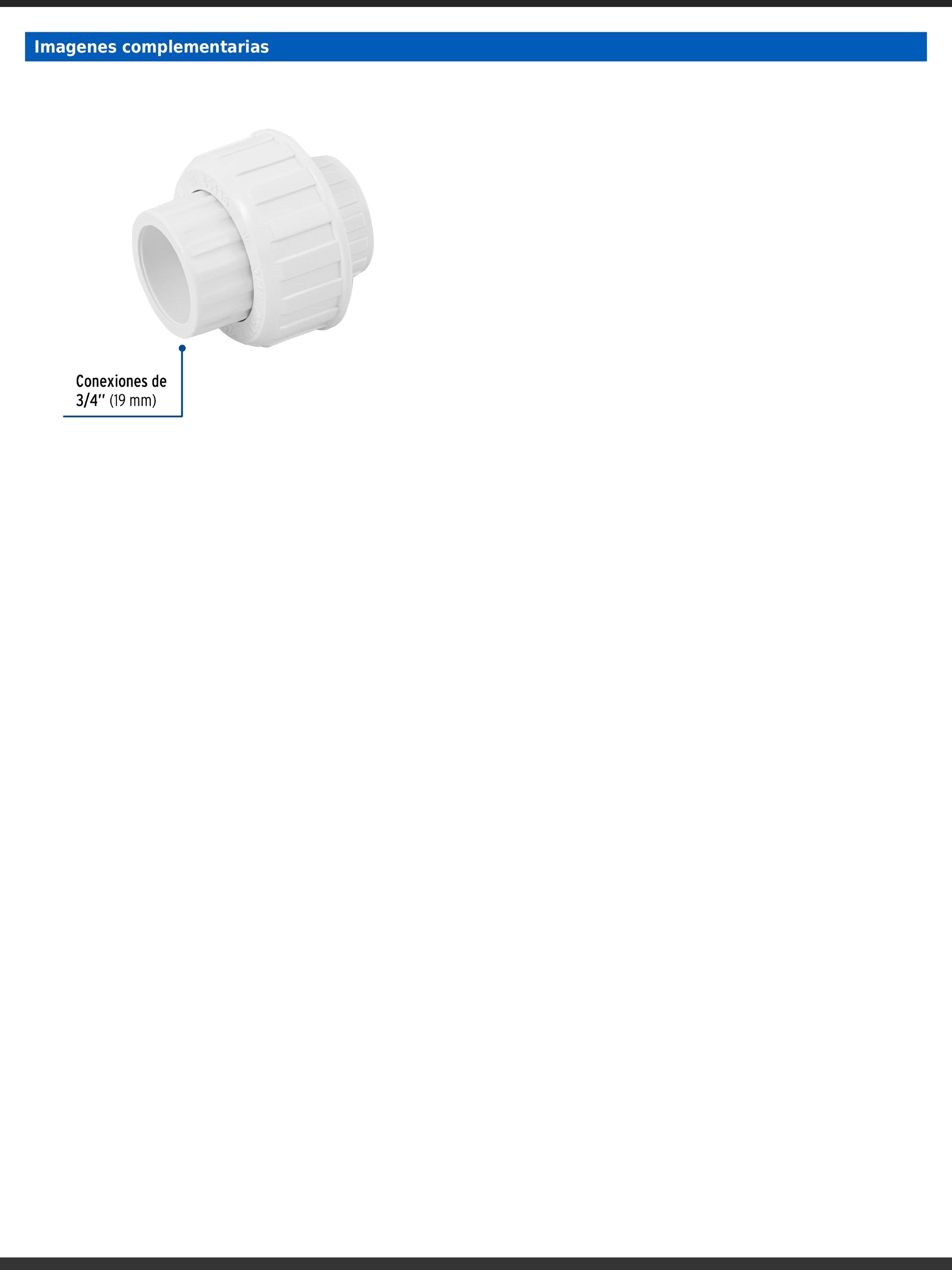 Tuerca unión lisa fabricada en PVC cédula 40, diseñada para cementar a tubería de PVC. Es resistente a la corrosión, oxidación, incrustaciones y fracturas por impacto. No contamina los fluidos que transporta, no genera par galvánico ni propaga el fuego. Su instalación es sencilla y rápida, ideal para conducción de agua fría a alta presión.