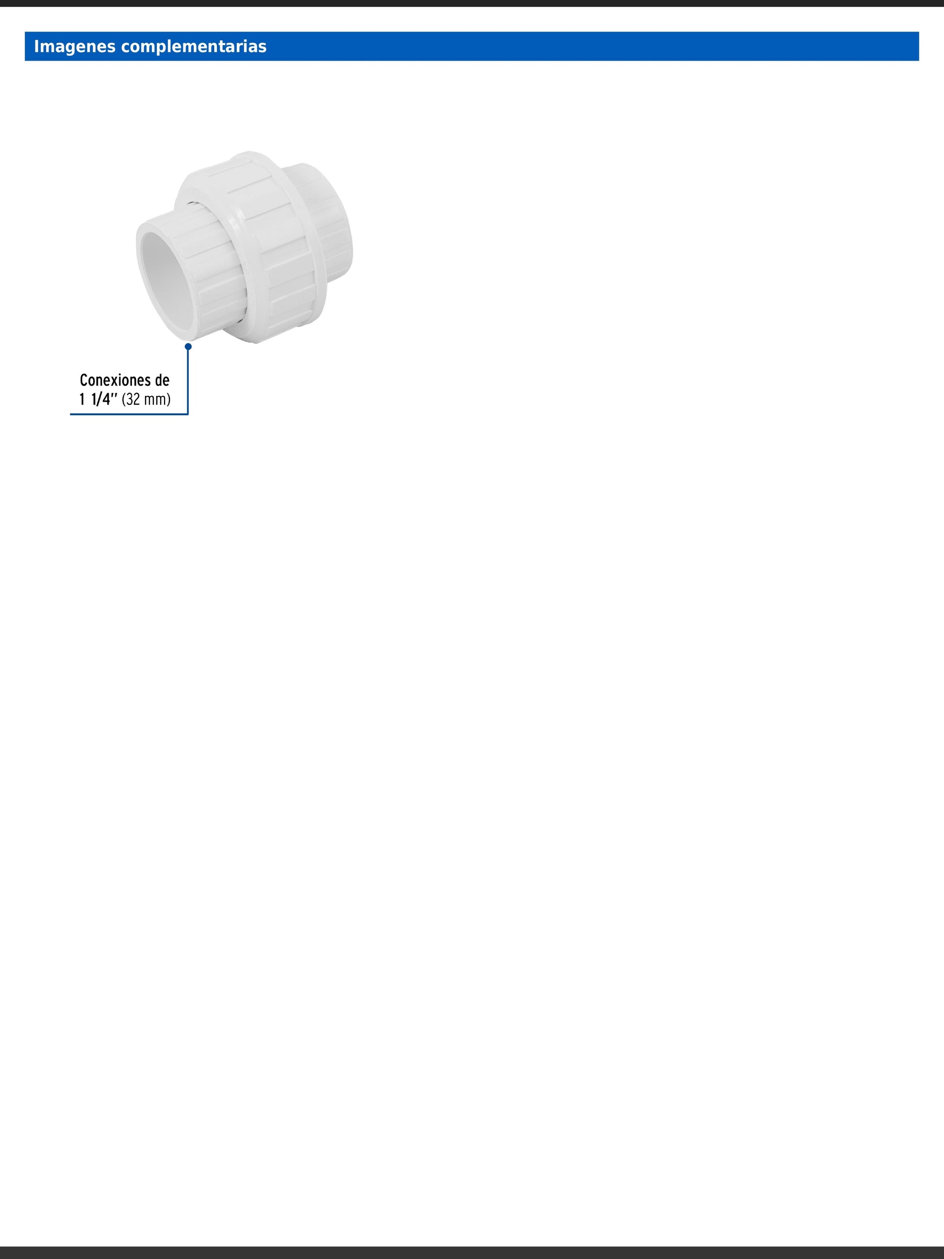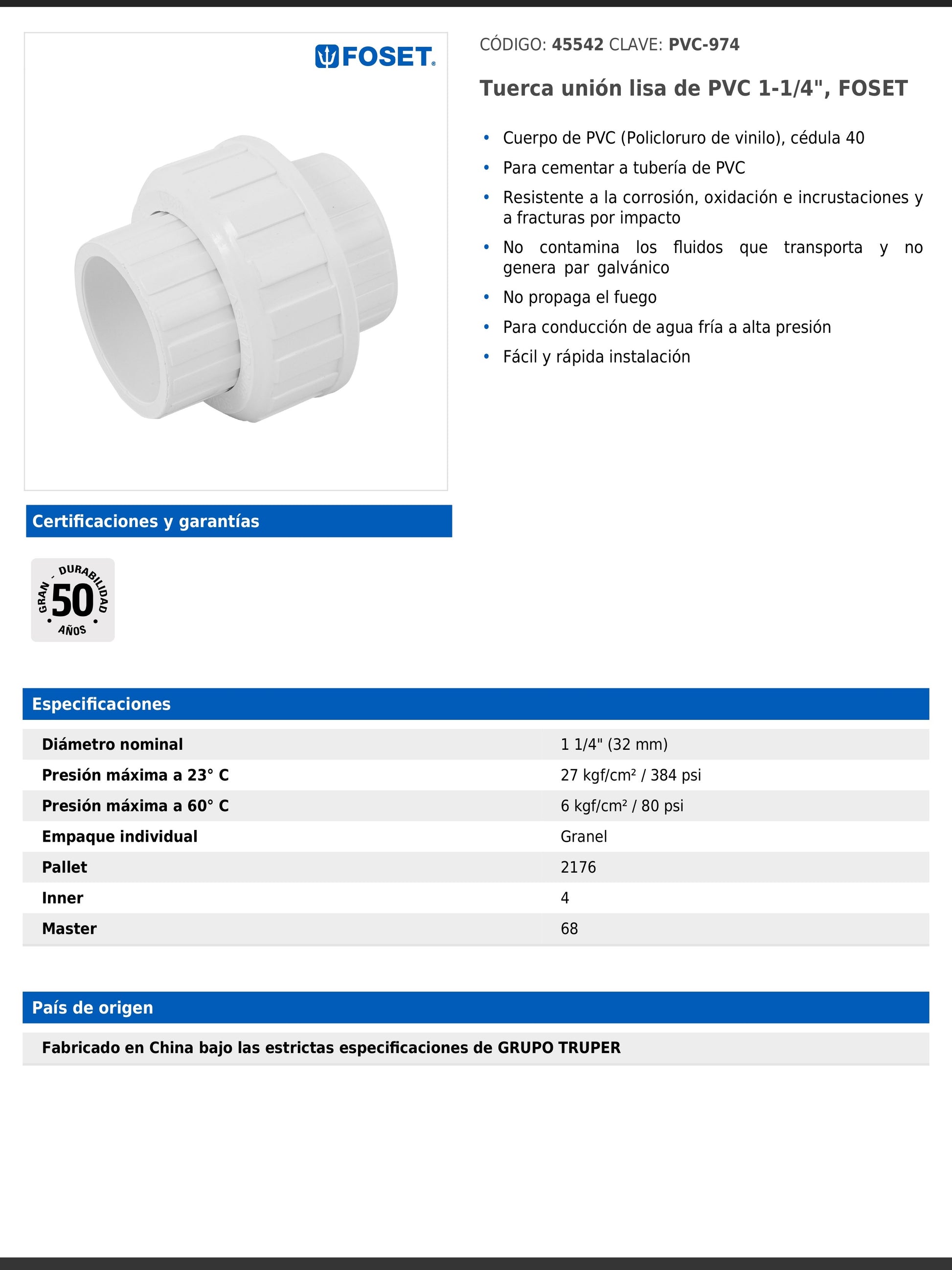 Tuerca unión lisa fabricada en PVC cédula 40, diseñada para cementar a tubería de PVC. Presenta resistencia a la corrosión, oxidación, incrustaciones y fracturas por impacto. No contamina los fluidos que transporta, no genera par galvánico y no propaga el fuego. Su instalación es rápida y sencilla, ideal para conducción de agua fría a alta presión.