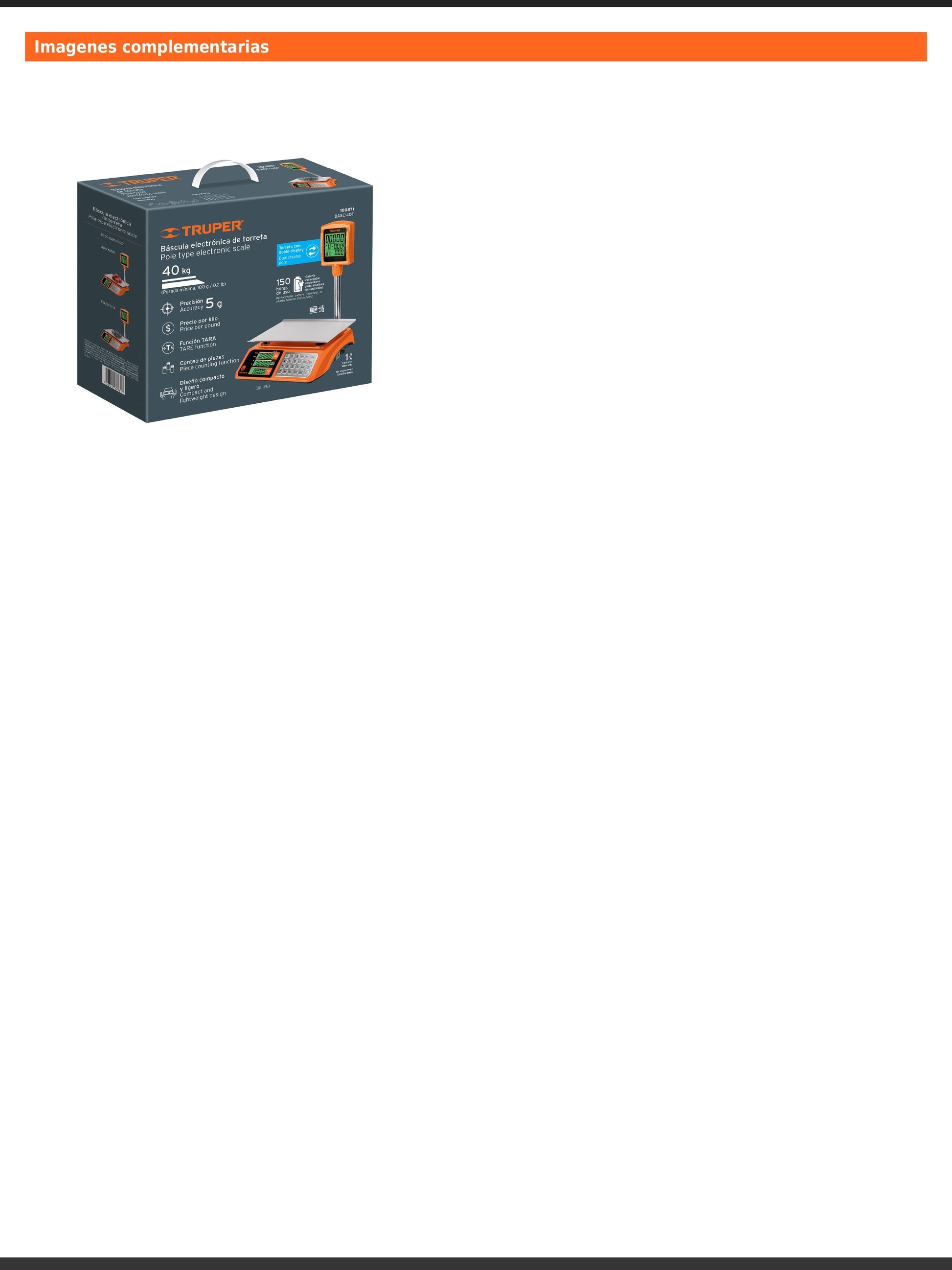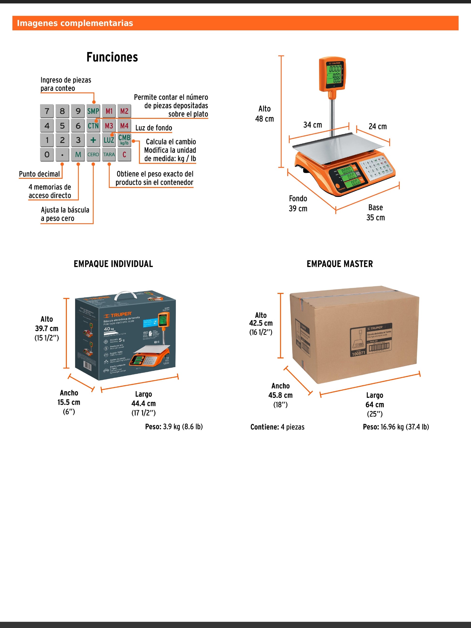Báscula electrónica multifunciones con torreta de 40 kg, construcción robusta, plato de acero inoxidable y patas niveladoras. Incluye torreta con doble display LCD verde de gran tamaño, función TARA, conteo de piezas, caja registradora, alarma por sobrepeso, memorias y teclado de acero inoxidable.